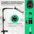 【Flexible Adjust Height and All-Angle】The most innovative design of webcam stand is that the bracket rod can be flexibly adjusted 360-degree rotation and 180-degree bending to any angle and position you need. Max height 22 inches. It can achieve over 15.7" of horizontal reach and 360° rotation; 31.5" of vertical adjustment and 180° rotation. You can also show more of your DIY creativity! 【Super Strong Joints With Fixed Gears】Are you still using bendable snake arms and swing arms that will move and fall over time due to gravity? Our phone camera stand with fixed gears can solve all your worries! Durable reinforced aluminum alloy camera desk mount with outstanding bearing capacity, max load up to 3.5 lbs. Super safe and stable for your valuable devices. 【3-in-1 Wide Compatibility】1/4" adapter is compatible with Webcam Brio 4K, C925e, C922x, C922, C930e, C930, C920S, C920, C960, C615, Action Cameras, GoPro Hero 9/8/7/6/5, Projectors, DSLRs, ring light etc with standard 1/4" screw hole. Comes with an extra standard 1/4" to 5/8" screw adapter can fit for Blue Yeti, Blue Snowball, Yeti Nano etc microphones and shock mounts and more devices with a 5/8" screw hole. Also a universal phone holder is included for all 4"-6.5"(screen) smartphones. 【Stronger Anti-Scratching Clamp】The projector stand with an adjustable clamp base can open max to 2.2 inches. The clamp with sponge pad and we provide 2 extra rubber pads to protect your furniture from scratch, allowing you to securely clamp it on the desk, table, bed headboard, nightstand, kitchen counter etc. You can also carry the webcam holder stand anywhere since it is folded and extremely portable to carry. 【Easy to Use & Best Value】Easy installation within minutes, just several steps for assembly. We provide a standard user guide for you to make installation as easy & convenient as possible, if you have any problem, please feel free to contact us at anytime. Package includes: 1xAluminum Alloy Bracket, 1xDesk Clamp Mount, 1x3/8" Adapter, 1xMetal Ball Head, 1x1/4" to 5/8" Screw Adapter, 1xPhone Holder Mount, 2xRubber Pads, 1xUser Guide.
