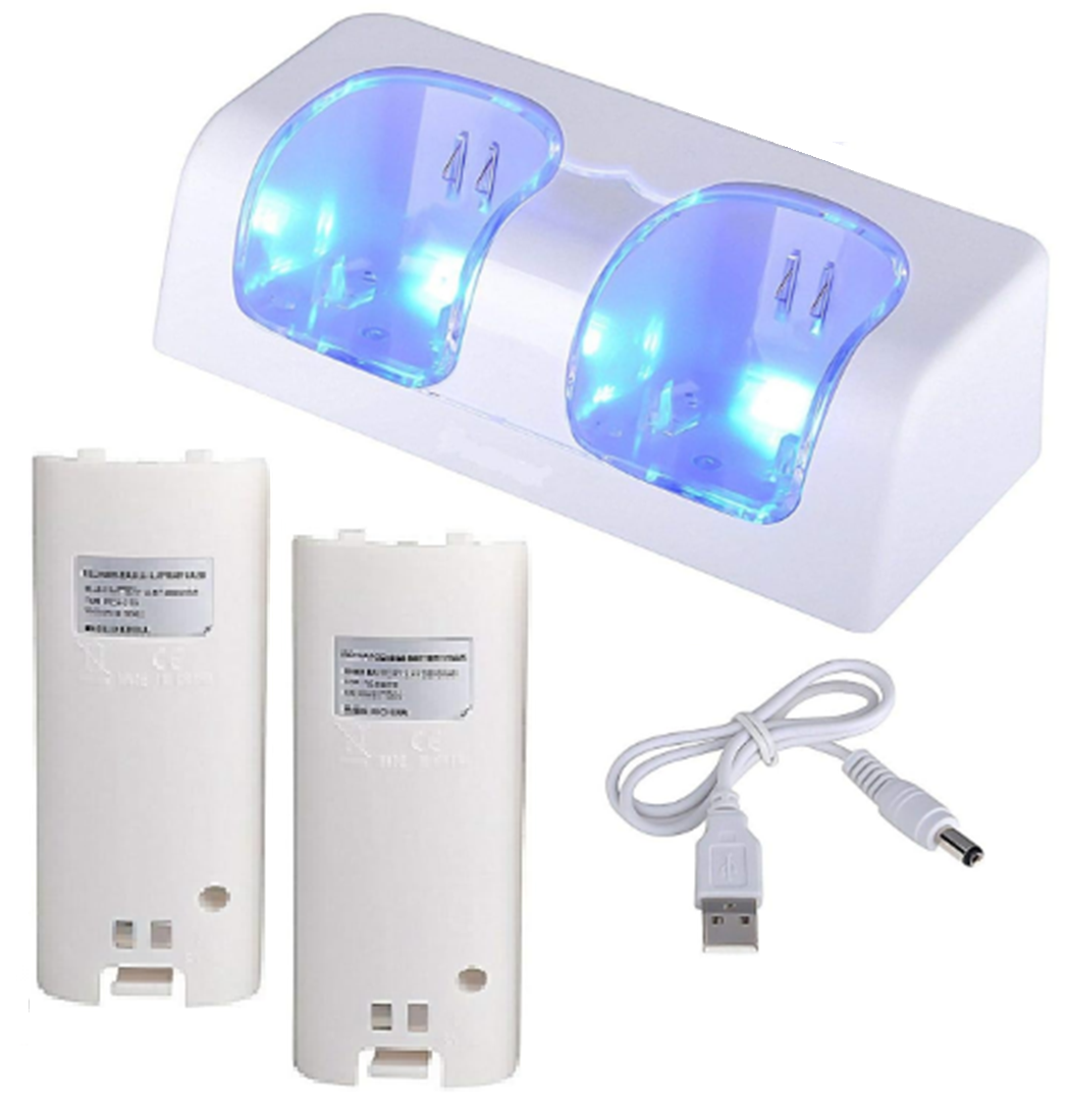 Dual Charging Station Dock with Two 2800mAh Rechargeable Batteries for Wii/Wii U Game Remote Controller Changed from Nickel-cadmium to nickel metal hydride, so improved 200% capacity compare with those normal 2800mAh rechargeable battery, lasts 3~5 times longer than the standard AA batteries. The rechargeable battery pack fits perfectly on the motion plus controllers. COOL LED LIGHT INDICATOR: red for charging or blue for fully charged Extremely lightweight and fully portable, easily stored away when it's not in use. FREE GROUND SHI PPING TO CONTINENTAL USA ONLY. OPTIONAL USPS PRIORITY SHIPPING FOR ONLY $7.