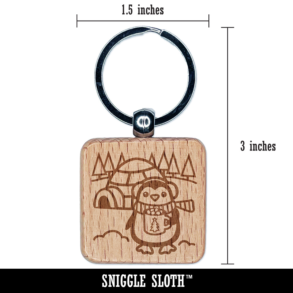 Winter Penguin Igloo and Hot Chocolate Engraved Wooden Keychain Charm