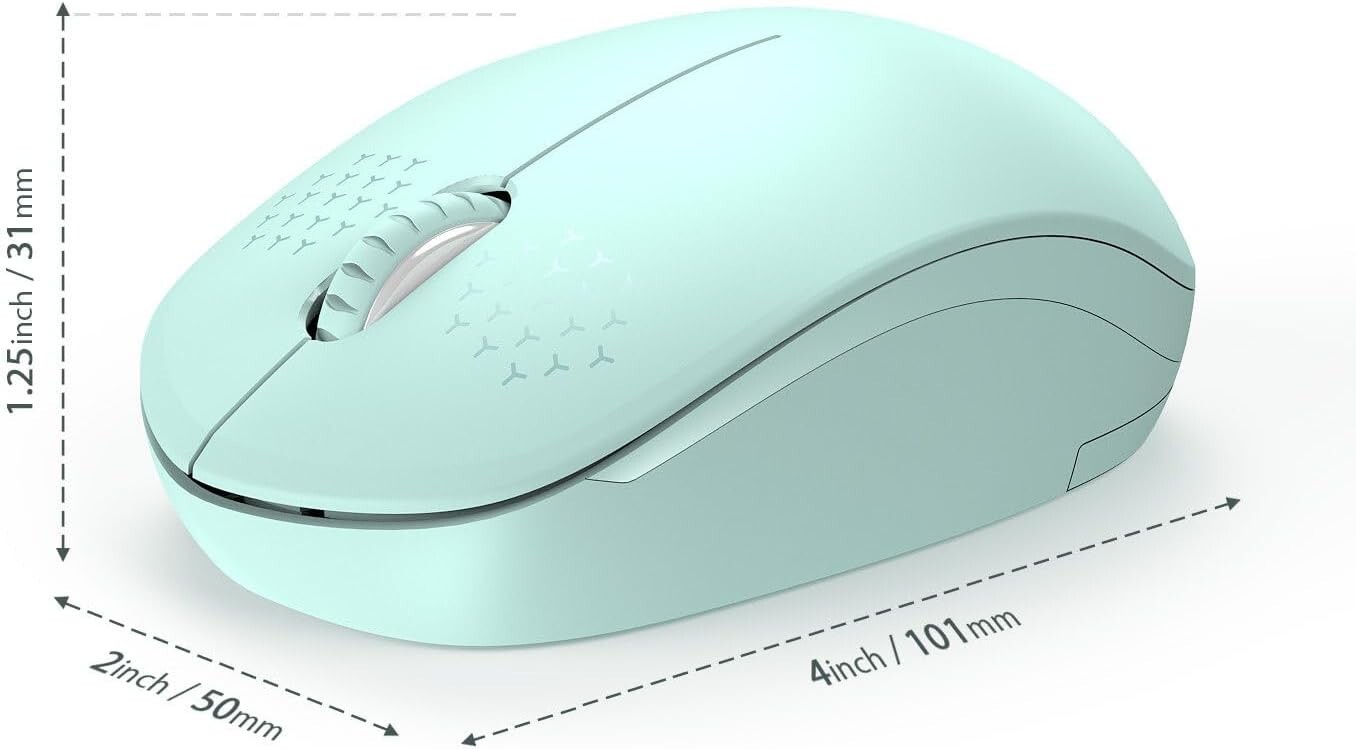 The wireless mouse is by seenda in mint green color. It operates noiselessly and connects via USB receiver or wirelessly at 2.4G. It has three buttons and is portable for easy use.
