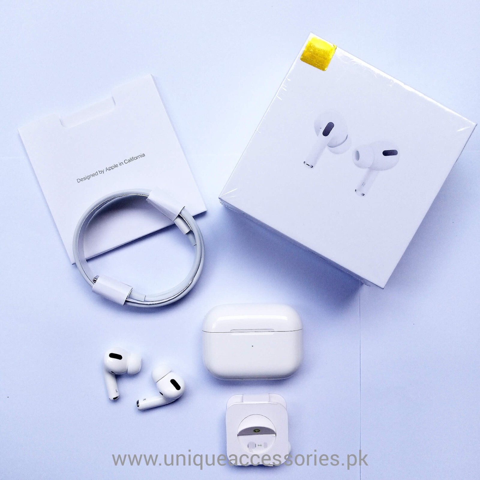 The product is the Apple AirPods Pro, a set of white UHF earbuds manufactured in the 2020s. These in-ear earbuds feature active noise cancellation and connect via Bluetooth for a wireless experience. The AirPods Pro come with a 6ft cable for charging and are designed with a compact form factor for easy portability. Made in China, these earbuds offer high-quality sound and advanced features for users seeking a premium audio experience.