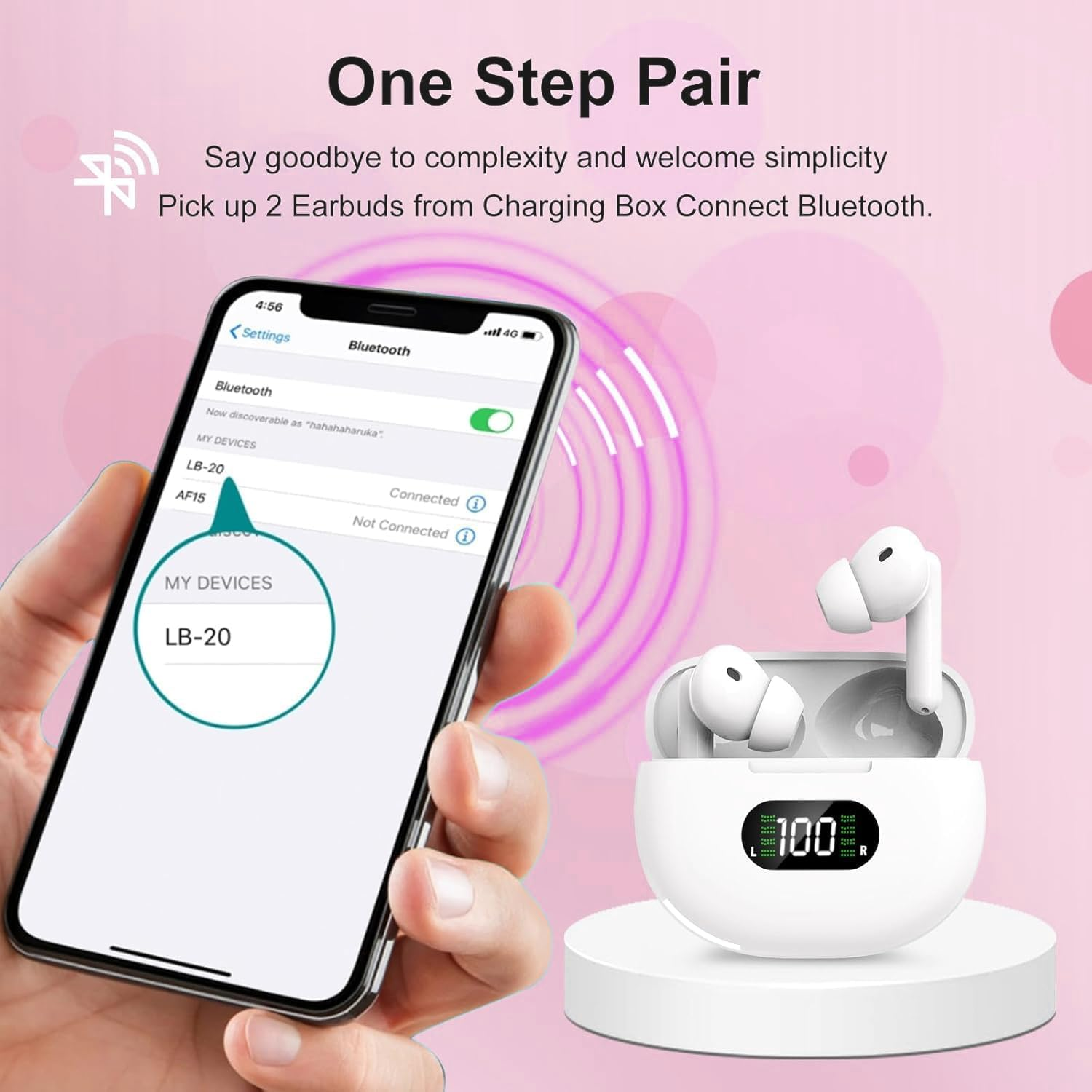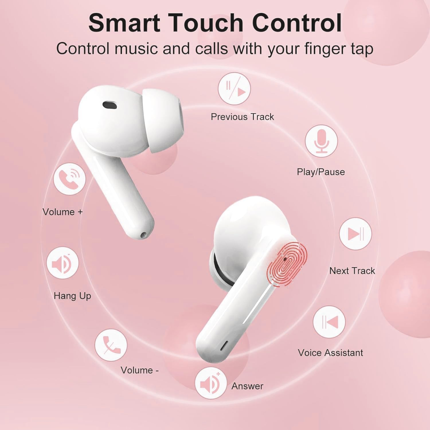 High-Fidelity Sound: With a 12mm speaker driver and ergonomic in-ear design, these earbuds deliver immersive sound, bringing out rich vocals and detailed midrange for your favorite tracks. Advanced Bluetooth Connectivity: Equipped with Bluetooth 5.3, these earbuds ensure fast, stable connections and minimal latency for an exceptional gaming and movie-watching experience. Dual Noise Cancellation: Enjoy peaceful listening with dual active noise cancellation that cuts ambient noise by up to 95%, achieving an impressive -48dB depth. Ease of Use: Enjoy effortless pairing with One-Step Pairing. Our smart touch controls let you manage music and calls easily: tap to play/pause or answer, double-tap to skip tracks, and long press to adjust volume – all without grabbing your phone. Power Display Design: The LED power display lets you check the charging case's power level anytime. With a 470mAh high-capacity case, these Bluetooth earbuds offer up to 45 hours of playback, keeping your music going all day long. Product Description