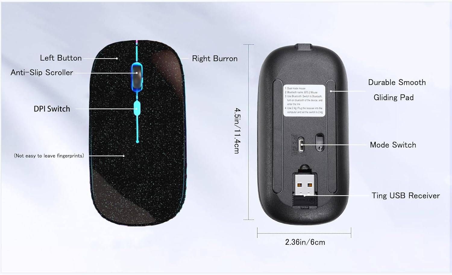 Wireless Mouse Bluetooth Pearl Black Product Details Product Dimensions: 4.4 x 2.3 x 0.1 inches Item Weight: 2.3 ounces Item model number: Wireless Bluetooth Mouse Batteries: 1 Lithium Ion batteries required. Manufacturer: WREANU Country of Origin: China Brand: WREANU Color: Pearl Black Wireless Bluetooth Mouse Connectivity Technology: Wireless, Bluetooth, USB Special Feature: Mouse, Wireless Mouse, Rechargeable, LED Lights, Bluetooth Mouse Movement Detection Technology: Optical 【Dual Mode Wireless Bluetooth Mouse】:(BT5.2/3.0 and 2.4 G)Dual Mode Realize the Free Switching of One Computer Mouse Between Two Devices;Bluetooth Mouse Mode Can Connect One Device Through BT5.2/3.0 and Wireless Mouse Mode Another Device Through a 2.4G USB Receiver,No Need to Install any Driver,Plug and Play;Wireless/Bluetooth Technology Provides Powerful and Reliable Connection,Which Can Enables Fast Data Transmission Without Delays or Dropouts,Effective Up to 10 Meters(33 feet)of Range;Note:The USB Receiver is Stored Inside The Back of The Mouse;You Can't Use Bluetooth Mode and 2.4G Mode At the Same Time. 【Rechargeable Wireless Mice Save Energy】:Cordless Mouse Built-in Durable 500 mAh Lithium Ion Battery,High Cycle Life;LED Wireless Mouse No Need Change Battery,It Can Be Easily Charged Using the Included USB Cable,Just 2 Hours Charging,You Can Use Than 7 Days of Working Time and 30 Days of Standby Time,Standby Time is Very Long;The Laptop Mouse Wireless will enter a sleep state after 5 minutes of inactivity,which saves power and can be used for a long time;You Can Wake USB Mouse Up By Clicking any Button. 【Colorful LED Breathing Light】:This Tablet Mouse With 7 Different LED Colorful Breathing Lights,Wireless Laptop Mouse for Laptop 7 Different Color Changes Randomly While in Use,Offering Soothing Lighting;Creating Cool and Fancy Atmosphere for Work and Play;LED Mouses Can Give You More Fun During. 【3 Adjustable DPI Levels】:Wireless Computer Mouse with 800 / 1200 / 1600 DPI Resolution Optical Tracking Technology provides more sensitivity than standard optical mice for smooth and precise tracking on a wide range of surfaces;you can freely choose your cursor speed,reduces muscle fatigue and boost your workflow;whether working on spreadsheets,browsing the web,or gaming,this wireless mouse will ensure smooth and responsive performance. 【Wide Compatibility Wireless Mouse】:This Wireless Bluetooth Mouse for Laptop,PC/Tablet/Mac/ipad/iphone;It is Compatible With Android/Chromebook/Windows/Vista/Linux/Notebook/Mac OS and Other Devices;Suitable for Homes、Offices、Travel and More. 【Anti-Fingerprint,Skin-Friendly for Comfort】:apple magic mouse with classic design with anti-fingerprint Surface Coating Technology Gives You a Skin-Like comfort Touch,The sturdy anti-slip rubber scroll wheel ensures that your hand will not slip when scrolling. 【Silent Click,More Focus】:The silent mouse features a unique silent click technology,ensuring the clicks are virtually noiseless,allowing you to enjoy 90 percent less click noise,so that you can stay focused on your work,allowing peaceful work without disturbing others,ideal for both office and home use. 【Portable Mouse】:Size About 4.4 x 2.3 x 1.1 inch,It Can Be Easily Put Into Your Laptop Bag and Ultra-Space Saving;Slim and Lightweight,Portable Durable Ergonomic Mouse is Perfect for Travel;Any Problem About The Wireless Usb Mouse,You Can Contact Us Anytime.