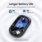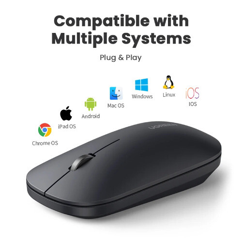 Bluetooth5.0 & 2.4G Dual Mode Wireless Mouse with 4000 DPI Bluetooth 5.0 Wireless 2.4G Wireless Dual Mode 4000DPI max. 99% Silent Clicking 3cm Ultra Slim Thickness 3 Million Clicks Long Lifespan Bluetooth5.0 & 2.4G Dual Mode Connect to 2 computers at the same time and switch easily 4000 DPI max. 1-Level DPI : 1000, Mouse cursor moves very slowly, suitable for precise drawing 2-Level DPI : 1600, Mouse cursor moves slowly, suitable for daily office use 3-Level DPI : 2000, Mouse cursor moves at normal speed, suitable for 2K display/screen 4-Level DPI : 4000, Mouse cursor moves at fast speed, suitable for 4K/8K large display/screen 99% Reduce Noise, Silent Click Perfect for public places such as study libraries, cafes, etc. It keeps silent click even at late night. It won't affect other people who concentrate on reading, studying, working or sleeping. For Right and Left Both Hands 3cm Height, Ultra Slim and Portable Perfect for storing into laptop bag, doesn't take up space Comfortable Hand Feeling Symmetrical design, suitable for left/right hand. Organic Shape, Natural Fit Designed to be extra slim, while still fitting naturally in the palm of your hand Comfortable Grip Smooth surface for nice long-time touch Long-Lasting Battery Life Adopted advanced process chip with intelligent power-saving technology, UGREEN cordless mouse with a battery life of up to 18 months. Note: The PC mouse is powered by a 1AA battery (not included). Note: The USB receiver is stored in the wireless mouse. Open the cover, and you will see it is beside the battery slot. Smart Sleep, Save Power & Extend Lifespan 2.4Ghz Wireless Mode: Level 1 sleep---After being operated for 3s, the mouse will go to sleep mode Level 2 sleep---After being operated for 20s, the mouse will go to sleep mode Bluetooth Mode: Level 1 sleep---After being operated for 3s, the mouse will go to sleep mode Level 2 sleep---After being operated for 30min, the mouse will go to sleep mode Magnetic Automatic Adsorption AA Battery slot USB Receiver slot ATTENTION PLEASE: Battery is NOT included in the package. Tiny USB Receiver Plug and play, no driver required. Suitable for all systems: Windows, Mac, Chrome OS, Linux and all other systems. For Surfaces Pad of Variety Material Using the new Blu-ray technology, Good tracking effect on surfaces of a variety of material, like Wood, Paper, Glass, Cloth Battery Installation Steps Notice: Battery is not Included Product Specifications Brand : UGREEN Model No. : MU001 Product : Silent Wireless Mouse Connection method ①: Bluetooth5.0 & 2.4G Dual-Mode Wireless Mouse (Pure Black color) Connection method ②: 2.4G Wireless Mouse (Light Black / Gray / Green color) Mouse thickness: 3cm Click button : Mute button, the lifespan of 3 million times Scroll : Metal material with silent encoder, 300,000 times lifespan 4-level DPI : 1000/1600/2000/4000, the default setting is 1600 USB Receiver : 2.4G 250Hz Distance : 15m Battery : 1x AA battery (NOT included) Connection : 2.4G Wireless DPI switch : Press the bottom DPI button to switch cyclically System : Universal compatibility(Windows 10/8/7, Mac OS, Chrome OS, Linux, and all others) Packaging : UGREEN retail box *Notice: For waking up the mouse, please move and click the mouse at the same time. Packaging