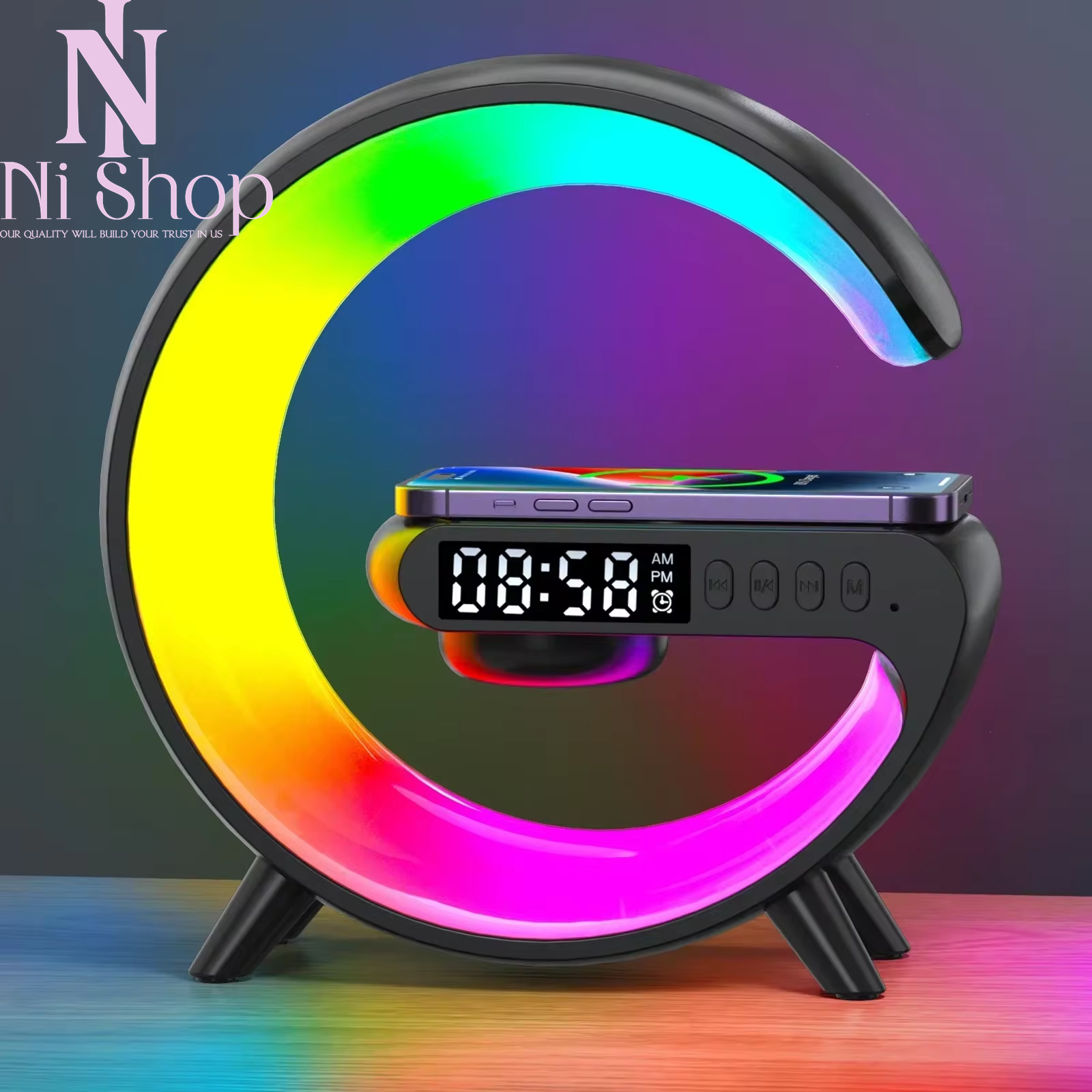 Menu Other Items Feedbacks About Us Contact Us Add To Favorites Wireless Charger Stand Pad with RGB Light Alarm Clock Speaker Fast Charging Dock Elevate Your Space: Wireless Charger Stand Pad with RGB Light, Alarm Clock, and Speaker Dear Modern Lifestyle Enthusiast, experience the ultimate all-in-one gadget that simplifies your life. The Wireless Charger Stand Pad with RGB Light, Alarm Clock, and Speaker is a must-have device for your desk or bedside table, combining fast wireless charging, immersive sound, and vibrant lighting in one compact unit. Why You'll Love This Device: Fast Wireless Charging Made Easy Enjoy 15W fast charging for all compatible phones. Simply place your device on the pad and power up effortlessly while you focus on what matters. Transform Your Ambiance Switch between 9 RGB lighting modes, including solid colors, two-color, and seven-color running lights. Perfect for creating a calming atmosphere or energizing your space. Wake Up Right Every Day Integrated alarm clock keeps your mornings on schedule. Combine style and functionality for a seamless wake-up experience. Premium Bluetooth Speaker High-quality 5W Bluetooth audio delivers rich, immersive sound. Play music via AUX, TF card, or Bluetooth for your favorite tunes anytime. Compact, Portable Design Mini-sized at 15x15x5.5cm, this lightweight gadget fits anywhere, making it ideal for home, office, or travel. Key Benefits: Versatile 5-in-1 Device Combines wireless charging, RGB lighting, alarm clock, Bluetooth speaker, and music playback in one stylish unit. Enhanced Compatibility Works with all wireless charging-enabled phones and supports AUX and TF card playback options for added flexibility. User-Friendly Features Easy-to-use buttons, including a "M" button for lighting mode control and one-touch power on/off functionality. Energy Efficient 75% charging efficiency and built-in battery support for Bluetooth speaker playback without wasting energy. Customizable Lighting Create the perfect ambiance for work, relaxation, or parties with adjustable light effects. Specifications: Input Voltage : 12V/2.5A Wireless Output : 5W/7.5W/10W/15W (Max) Bluetooth Version : 5.0 Transmission Distance : 5-10mm Charging Efficiency : 75% Speaker Power : 5W Material : ABS PC Lighting Modes : 9 modes (solid, two-color, three-color, seven-color) Net Weight : 250g Product Size : 15 x 15 x 5.5cm Features: 15W Fast Wireless Charging : Ensures rapid and efficient charging for your devices. Vibrant RGB Lighting : Choose from 9 customizable light modes to match your mood. Multi-Functional Bluetooth Speaker : Supports AUX, TF card, and Bluetooth playback. Compact and Portable : Designed to fit seamlessly into any space. Alarm Clock Mode : Keep your schedule on track with an integrated time display and alarm. Package Includes: 1 x Wireless Charging Pad 1 x Type C Charging Cable 1 x User Manual Pro Tips: Use a QC 3.0 power adapter for optimal performance and simultaneous multi-functionality. Press and hold the second key for 3 seconds to power on. Upgrade Your Lifestyle Today Make your space smarter, more organized, and visually stunning. Add the Wireless Charger Stand Pad with RGB Light, Alarm Clock, and Speaker to your cart now and redefine convenience. Dimensions Shipping Returns Additional Info Product Dimensions: 18.0 inches x 18.0 inches x 8.0 inches. Weight: 0.379 kg Fast shipping is very important for us. Our standard shipping service is FREE. Your order will be shipped within 1-3 business days upon full payment received. Most items are delivered within 3-5 business days, however, please allow 3-10 business days. We are shipping only to USA. We only ship to the confirmed Paypal address. We reserve the right to cancel any order for any reason at any time. We are not responsible for undeliverable addresses. We offer a 30 day return policy from checkout winning date. Your satisfaction is guaranteed! If for any reason you are unhappy with your item, just return it within 30 days for a full refund, minus shipping cost. Please contact us prior to initiating a return so that we can issue you a refund authorization. Items defective upon receipt must be packaged in their retail packaging as if new and returned with a detailed description of the problem. Return shipping fees are not refundable. We reserve the right to decline any returns if the above guidelines are not followed. All of our items, unless otherwise stated, will only run on 120 volts. Please check to make sure your country complies with these specifications. If you have a problem or question regarding your transaction please contact us before leaving any type of feedback. We will work with you to resolve any problem you may have.