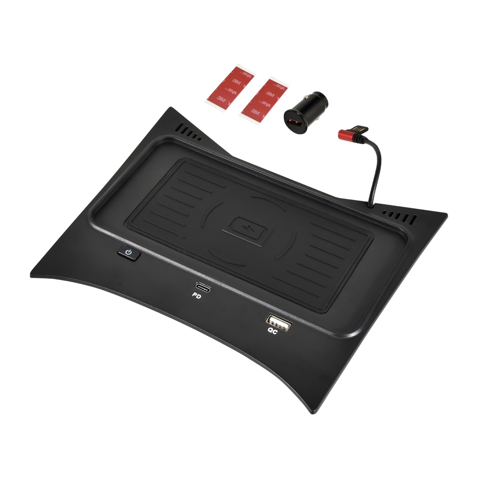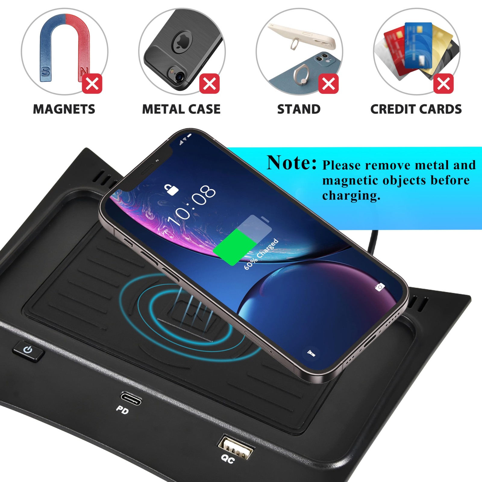 This car wireless charger suitable for Nissan Rogue is compatible with all smart phones with wireless charging function, including iPhone 14Pro Max / 14Pro / 14 / 13Pro Max / 13Pro / 13 / 12Pro Max / 12Pro / 12 / 12 Mini / 11Pro Max XS Max / iPhone XR / iPhone XS / iPhone X; Galaxy S10 / S10+ / S10e / S9+ / S9 / S8 / S8+ / S7 edge / S7 / Note 9 / Note 8 etc. Specification: Material: ABS+PC Power: 45W(30W USB-A charging, 30W USB-C charging and 15W wireless charging) Intelligent foreign body detection FCC certification Plug and Play Feature: Premium Material: Made from ABS plastic and rubber, it can withstand road impacts. Non-slip rubber mat prevents small items from sloshing around and making noise. Design of Charging Indicator Light: There is a button on the charger to check the charging status. If you don't need to continue charging, just press it to stop charging. Fast charging: 30W fast wireless charging, plug and play, just insert the center console port, then place the phone in it to start charging. Compatible with any Qi enabled devices. NOTICE: 1. Please make sure your phone supports wireless charging. 2. Please keep the mobile phone in the charging area marked on the charger. 3. Please keep the mat out of the direct sun when the weather is hot, high temperatures will cause a slow charge. 4. When there are foreign materials between the device and the wireless charger, the device may not charge properly, so please remove metal or magnet objects from the phone before charging. 5. Do not place metal objects, magnets, RFID cards, holders, or credit cards in between your device and the wireless charger. These may block wireless signals or cause overheating. Fitment - Multi functional wireless charging is newest customized design for Nissan Rogue 2014-2020 (S ,SV SL)/ Nissan Rogue Hybrid 2017-2019 (S ,SV SL)/Nissan Rogue Sport 2017-2020 (S ,SV SL). It is a must-have accessories to upgrade your rogue. Compatible with all smartphones with USB-A (QC 3.0+) charging port, USB-C (PD 3.0+) charging port and wireless charging mode, such as iPhone, Galaxy, etc., and can charge three phones at the same time (make sure your phone supports wireless charging) Multifunctional Charger - wireless charging for nissan rogue s is equipped with three modes: USB-A, USB-C, and wireless charging. Among them, USB-A and USB-C are 30W fast charging(when use alone), and the wireless charging mode is 15W normal charging speed. 2 non slip silicone pads, with wireless charging area on the left and storage area on the right, which are both non slip and easy to clean Stable Performance - rogue hybrid wireless charger complies with international Qi wireless charging standards and has passed FCC/CE/RoHS certification. Equipped with intelligent temperature control protection, when the product temperature is too high, the charging power will automatically decrease until the temperature returns to normal, ensuring safe use. This wireless charger adopts intelligent FOD (foreign object detection) to prevent overheating, overvoltage, and short circuit. If charging is not possible, please check if there are coins, IC cards, bank cards, or other metal objects between the phone and the charger Comprehensive Upgrade - rogue sport wireless charger is made of high-quality ABS+PC materials, with high hardness, wear resistance, and durability; And it is equipped with detachable and easy to clean anti slip rubber pads, which not only prevent the phone from sliding during high-speed driving, but also facilitate cleaning; The widened heat dissipation holes on the back greatly improve charging efficiency; Built with indicator light showing the charging state, and designed with a ON-OFF button, turn it off then you can put anything on it as you want Packagie Includes - 1PCS car wireless charger, 1PCS cigarette lighter plug, and 2PCS spare 3M double-sided tape. Easy to install, simply connect the plug to the cigarette lighter port, then place your phone in it to start charging. Perfect Gift for valentines day/anniversary/birthday/mothers day/fathers day/christmas. Any question, please feel free to contact us