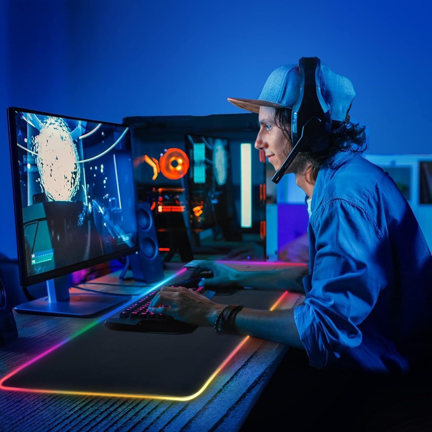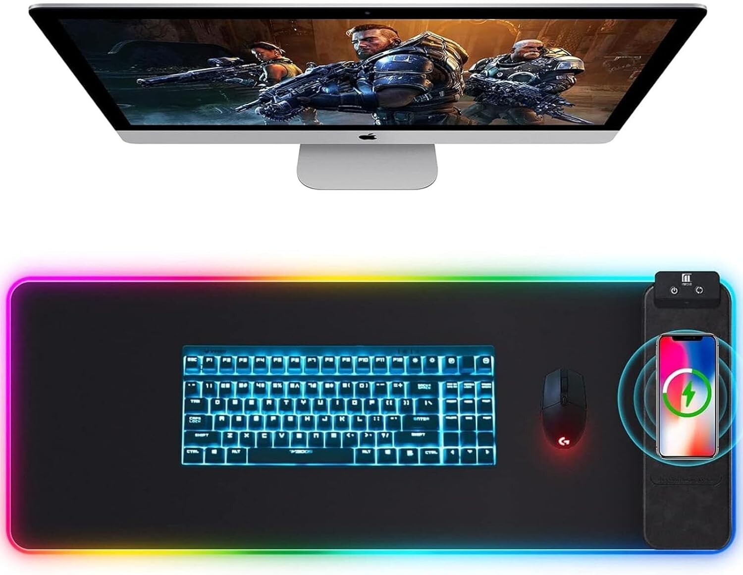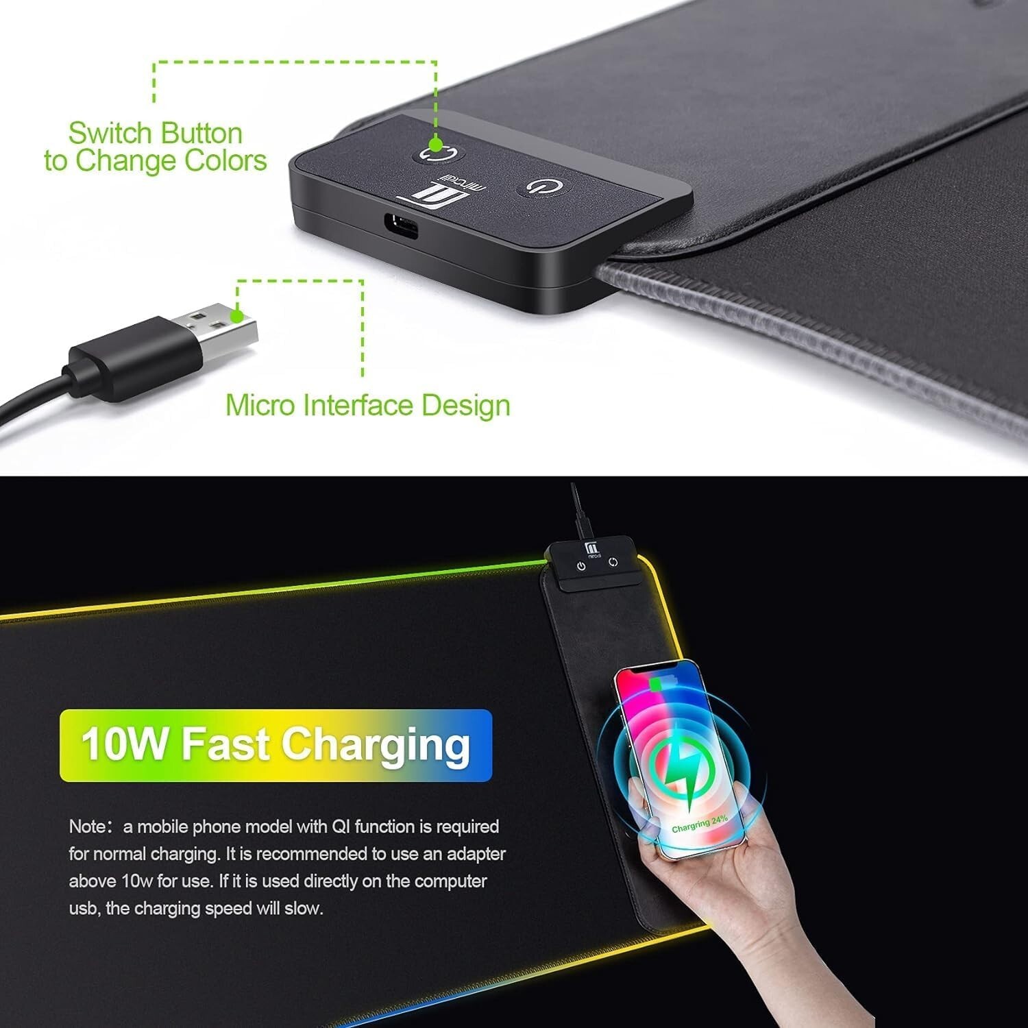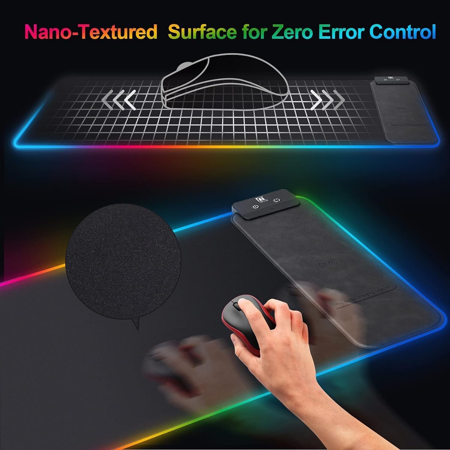 Mouse Pad with Wireless Charging, Large Desk Mat RGB Gaming Mousepad, 10 Light Colors LED Desk Pad Keyboard Pad with Ultra-Smooth Surface & Non-Slip Rubber Base, Waterproof Full Desk Mouse Pad ✅【LED Cool Mouse Pad】RGB Desk Mat features 10 lighting modes, including colorful dynamic breathing light mode and monochrome static light mode, making your gaming atmosphere cooler, more interesting and colorful. The power-off memory function remembers the last lighting mode you selected. ✅【Mousepad with Wireless Charging】Mouse pads for desk with 10W wireless charging function. Gaming Mouse Pad compatible with i 15/14/13/12/11/X/XR/XS/8 series, Samsung Galaxy S23/S22/S21/S20/S10/S9/S8/Note 9/8 and other smarts that support wireless charging and other Qi enabled devices. (Note: Power adapter is not included with this Mousepad) ✅【Smooth, Waterproof & Non-Slip】Full desk mouse pad. Nano-textured cloth surface, for extremely precise mouse control and a smooth movement. Waterproof surface is easy to clean. Anti-slip base can firmly grip your desktop and nylon stitched edges make the pad much more durable and longer lasting. ✅【Large Size Desk Pad】The inch computer mouse pad fits your desktop perfectly and provides a lot of space for movement. The large mousepad is suitable for computers and keyboards and mice, bringing the greatest help to your work environment or games. ✅【Easy to Use】Large desk pad is powered by USB and no driver required. One button controls all light modes, press once to switch light color, long press to switch light modes. The wireless charging function and RGB lighting can work separately. Just Plug and Play. Awesome Gaming Mouse Pad for Gamer Esports Pros.