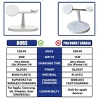 【3 In 1Wireless Chargers】 30W The new technology delivers seamless magnetic alignment and fast wireless charging in the easiest way for iPhone 14 ,13, 12 series, iPhone 12 Pro Max, iPhone 12 Mini and Airpods, Airpods Pro and Apple Watch 7 6 SE 5 4 3 2 (Not for Samsung watch) 【Fast & Safety Charging】 The wireless charging pad is built-in high- efficiency components and advanced chips which provides temperature control, overcurrent and overvoltage protection, foreign object detection. It also can greatly improve the charging speed of wireless charger dock. But please use suitable adapter to charge. 【Upgraded Nine Security Protections】 Built-in intelligent chip, safe and quick charging without damaging the device. 【Dual Magnetic Core with Strong Attraction】 Double magnetic ring helps reduce leakage flux and ensures automatic and precise alignment between a phone and this wireless charger Product Attributes: 1.Charging method: electromagnetic induction 2.Interface: TYPE-C 3. Mobile Phone Wireless Charging Power:30W 20W 15W 10W 7.5W 5W (30W will be faster than others) 4.For apple watch output:3W 5.For Airpods output:3W 6. Input voltage/current: 9V-2A/12V-2A Wireless Magnetic Charging Bracket 30W - Compatible with Apple12 13 14 series - Double ferrite ring - A total of 30W peak output - Wireless charging of mobile phones and earphones (Upgraded Version) Note 1: Wireless charging station can charge your for apple iwatch 2/3/4/5/6/SE/7 【NOT for Samsung Watch】 , Airpods Pro/2/3, phones at the same time, such as for iPhone 13/13 Pro/13 Pro Max/13 Mini/12/12 Pro/12 Pro Max/12 Mini Note 2: The original Apple adapter cannot match this product due to compatibility issues. Please use our professional matching adapter, or other adapters larger than 18W. Note 3: This product is specially designed for iPhone 14 13 12 series mobile phones. For other iPhones that support wireless charging, please add magnetic plate 【What You Get】 1 X 3-in-1 charger stand, 1 X USB to C cable
