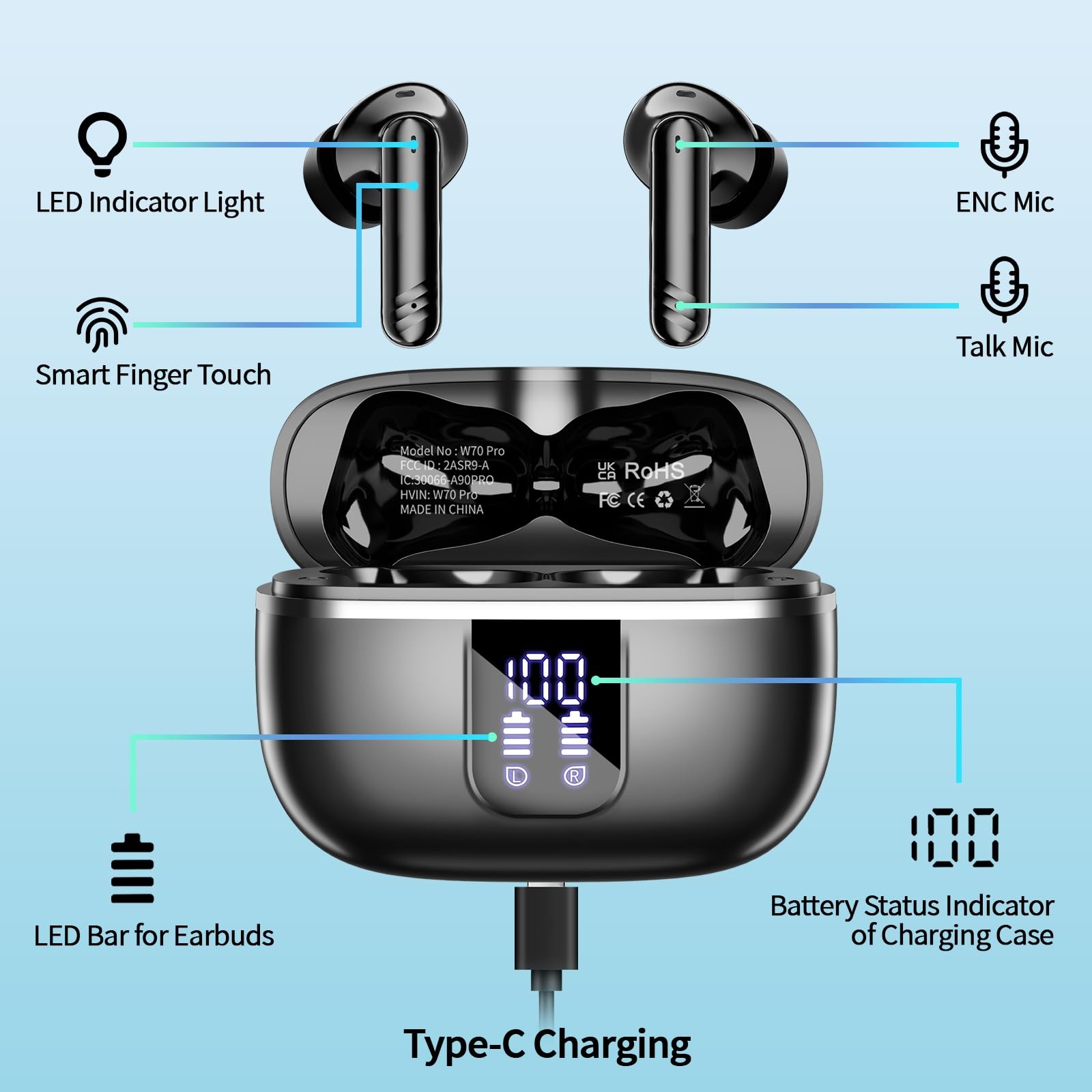 This year’s latest Bluetooth 5.3 wireless ear buds has high-definition HiFi stereo sound quality and four high-definition ENC noise reduction microphones, providing a clear call experience. The ear buds offer 40 hours of playback for an all-day music experience. The ear buds bluetooth have dual LED digital displays that can display the charging status of the earphones and the power of the charging box in real time. The earbuds use the most sensitive touch chip. You can control the wireless earbuds by touching them, easily answer/hang up calls, adjust the volume, switch music, and activate voice assistants. The bluetooth earbuds can also be paired in one step. The headphones are equipped with IPX7 waterproof nano-coating, which can effectively prevent the intrusion of sweat and rain, allowing you to sweat and run in the rain with confidence. The headphones are lightweight and comfortable to wear, allowing you to enjoy music anytime, anywhere, whether for leisure, work, sports or travel. Wearing W70 Pro bluetooth headphones can bring you a wonderful experience of wireless headphones. Our brand is committed to providing high-quality products to everyone. In order to give users a better experience, each design of this headset is based on a large amount of data to present the most perfect appearance and quality; humanized scientific design , in line with the usage habits of the people who need it. Our brand has good service. If you have any questions after purchasing the product, you can contact us at any time. We will provide you with excellent after-sales service. Cutting-Edge Bluetooth 5.4 Technology: Discover the future of audio with our state-of-the-art Bluetooth 5.4 technology. Enjoy lightning-fast connectivity, rock-solid stability, and remarkable interference resistance. Whether you're listening to music or taking calls, our wireless ear buds offer an extended range and lower power consumption, ensuring an unparalleled wireless experience. Premium Sound Quality and Crystal-Clear Calls: Unleash your music with our wireless earbuds, featuring a robust 14.2mm dynamic driver and a highly sensitive polymer diaphragm. Experience deep, resonant bass, crisp mids, and sparkling highs that bring your favorite tunes to life. With four advanced noise-cancelling microphones, every call is a breeze, delivering pristine audio that keeps you connected. All-Day Playtime and Dual LED Display: Keep the music going with 6-8 hours of playtime from a single charge, and an astonishing 38 hours with our high-capacity wireless ear buds bluetooth charging case. The Type-C quick charge takes just 1.5 hours—perfect for your busy lifestyle. Plus, the dual LED display keeps you informed about battery life and charging status, so you can enjoy seamless audio all day long. Smart Touch Controls and Hassle-Free Pairing: Take control with our intuitive touch-sensitive controls. Effortlessly play or pause your music, adjust the volume, switch tracks, and handle calls without reaching for your phone. After your first connection, simply open the case to instantly reconnect your wireless headphones bluetooth—making your listening experience smoother and more convenient than ever. Ergonomic Design and IPX7 Waterproof: Crafted for comfort, these lightweight wireless earphones bluetooth (only 3.9g!) fit snugly in your ears, making them perfect for long listening sessions. Built with premium materials, they’re not only durable but also portable. Thanks to the IPX7 waterproof nano-coating, your wireless earbuds bluetooth are protected against sweat and rain, ready to keep up with your active lifestyle. Perfect for Every Occasion and Broad Compatibility: The W70 Pro bluetooth ear buds wireless are your ultimate audio companion, whether you’re working, studying, exercising, traveling, or gaming. With broad compatibility across iOS and Android devices, they seamlessly connect with smartphones, tablets, laptops, and more. Transform your music experience on the go with the W70 Pro bluetooth earbuds wireless!