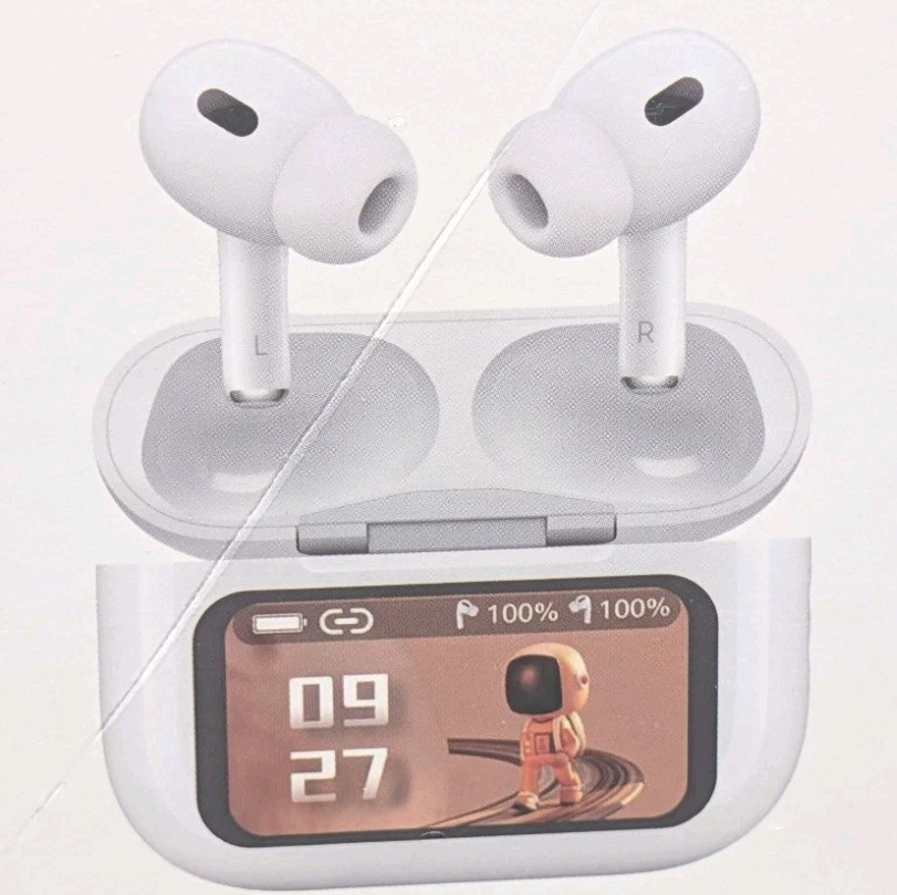 These are white InEar wireless earbuds with active noise cancellation and touch control. They come with a digital display charging case for convenience. The earbuds have a 13mm driver size, Bluetooth connectivity, and built-in microphone for hands-free calls. Other features include replaceable ear tips, sweat-proof design, wireless charging capability, and a rechargeable battery. Made in China.