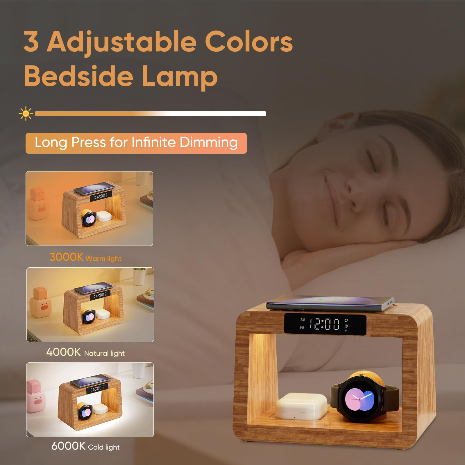 ⚡[5-in-1 Multi-Function Charging Station] This versatile wireless station samsnug combines a 3 IN 1 wireless Charger, Digital Alarm Clock, and Adjustable Bedside Lamp, catering to an array of devices like Samsung Galaxy, Watches and Headphones. 15W Fast Charging for Samsung Galaxy phone which support wireless charging and offers 5W Wireless Charging for Watches. Also, it supports 5W wireless charging for Samsnug Galaxy Buds. Note: Watch charging is exclusive to Samsnug Galaxy Watch 💡[3 Different Mode Night Light] Samsnug high speed charging station with night light offers three color switching options and four different brightness modes. It features warm light, natural light, and cool light, providing 3 color light options with 4 brightness levels adjustable from 6000K to 3000K. Simply touch the button again to turn off the light! This bedside lamp is a helpful companion for nighttime visits, being gentle on the eyes, and protective of your vision ⏰[Digital Alarm Clock& Night Light] Our wireless charging station comes equipped with a digital display clock and alarm function. The brightness of the digital display clock can be adjusted with four modes to choose from, (Press the "H+" to adjust) allowing you to tailor your perfect ambiance. Single press the "M+" to adjust low or high volume of clock button, which is offered to cater to different individuals, especially heavy sleepers 🍀[Decorates Your Home] Crafted from 100% organic bamboo meet with CPF Certification, this galaxy wireless charging station fast is not just a powerful charging device but also a piece of safety decorative home art. Whether placed in your bedroom, living room, or study, its exquisite design will add a touch of elegance to your space ✅[Protecting Your Devices] Designed for fast 15W wireless charging with comprehensive safety features. Wireless charging docking station samsung includes over-current, over-voltage, over-heating protection, and foreign object detection to prevent overcharging and protect your device battery. The top and bottom of the wireless samsung station feature high-quality rubber pads to prevent slipping or surface scratches 🎁[Present from the Heart] Our wireless phone charger station samsung is beautifully packaged, combining modern minimalism with profound meaning. It's the ideal choice for birthdays, celebrations, and Christmas. Universally appealing, it makes an impeccable gesture for women, men, fathers, mothers, spouses, sisters, and cherished friends. Experience the perfect blend of elegance and functionality with our samsung fast wireless station 💟[Case Friendly] Enjoy hassle-fr·ee charging without removing your phone case. Our samsug galaxy wireless station can transmit power directly through cases up to 0.2 inch (5mm) thick, saving you the inconvenience of removing ultra-thin protective covers. Please remember to remove credit cards and holders before charging