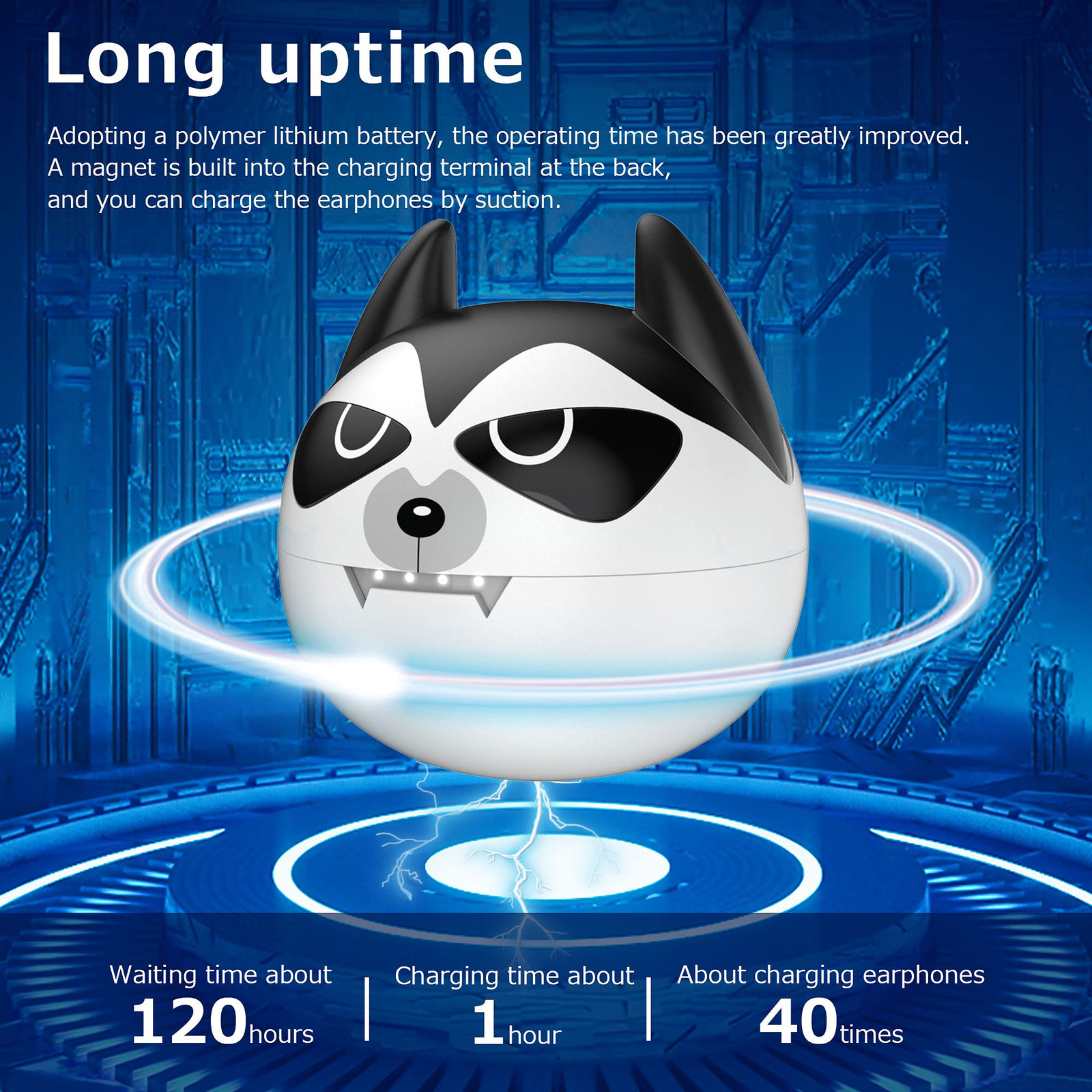TWS Bluetooth 5.1:Our wireless earbuds for kids equipped with the latest Bluetooth 5.1 and advanced audio chipset for faster connection, lower latency, high fidelity sound quality to ensure clear calls, deep bass and 3D surround sound for immersive concert listening. Noise Canceling and HIFI Sound Quality:Our mini wireless earbuds bluetooth equipped with CVC8.0 Noise Canceling technology reduce the noise up to more than 25dB. Built-in high quality mic and lossless Hifi rendering technology for incredible music experience.Give you the real best experience of hands-free calling. Intelligent Touch Control:Just by touching the surfaces of the two true wireless earbuds for kids with your fingertips, you can control music playback, calls, Game mode, volume control and voice assistant. One Step Pairing A2DP Technology:The in ear stereo earphones after the first pairing with the phone, pick up 2 earbuds from charging box they will connect each other automatically. You can use the headset to connect two devices at the same time and switch easily. An Ideal present for Child:Our small wireless earbuds was inspired by the round ball and the lovely image of panda. The cute Husky cartoon appearance and high fidelity sound quality makes it the best gift for children at Christmas, Halloween, New Year, birthday, Easter
