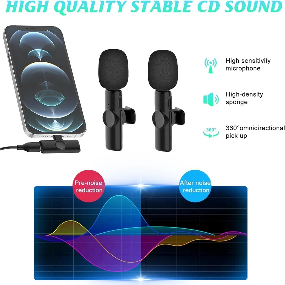 Audio Sensitivity: 30 dB Microphone Form Factor: microphone for iphone, Lavalier, Mini, Play and Plug, Clip, lapel microphone wireless, microphone Power Source: Battery Powered Number of Batteries: 1 Lithium Ion batteries required. (included) Material: Plastic Signal-to-Noise Ratio: 80 dB Hardware Platform: iPhone (Fit iPhone14 and Below) Number of Channels: 1 Manufacturer: GOGARA Item Weight: 1.44 ounces Package Dimensions: 3.58 x 3.23 x 0.75 inches Country of Origin: China Item model number: MIC-A Batteries: 1 Lithium Ion batteries required. (included) Color Name: Black Material Type: Plastic Battery type: Lithium Ion Recommended Uses For Product: Streaming, Video Conference Brand: GOGARA Model Name: Microphone for iPhone (Fit iPhone14 and Below) Connectivity Technology: Wireless Connector Type: Lightning, (Fit iPhone14 and Below) Special Feature: 1-Touch Recording, Mini Microphones, Noise Reduction, wireless lavalier microphone, Omnidirectional Mics 1-Touch Recording, Mini Microphones, Noise Reduction, wireless lavalier microphone, Omnidirectional Mics1-Touch Recording, Mini Microphones, Noise Reduction, wireless lavalier microphone, Omnidirectional Mics See more Compatible Devices: Only fit iPhone14 and Below Color: Black Included Components: 2*Mini Microphone, 1*Receiver, 2*Anti-spray Sponge, 1*Type-C Charging Cable, 1*User Manual Polar Pattern: Omnidirectional 【Microphones for iPhone with Great Sound Quality】This Wireless Lapel Microphone have 360° all-round accurate sound pickup. providing effective identification of the original sound and clear recording in noisy environments. The sponge windscreen reduces wind noise and plosives, strong anti-interference ability, meet your pursuit of high sound quality. 【Mics Plug and Play】This Wireless microphone is easy to use. Plug and Play. No Adapter, Bluetooth or Application needed. Just get the receiver into your devices, then turn on the portable mic, these two parts will pair automatically. Its a mini Lapel microphone, free yourself from the constraints of the cable, just clip the microphone on your shirt and click it then you can enjoy the recording now. 【Omnidirectional Mini Microphones with Noise Reduction】This Professional wireless lavalier microphone built in High Tech noise reduction chip, achive real-time auto-sync technology, and stable signal transmission with super low latency, the sound picking-up follows the picture in real-time. 【Podcast Microphone IOS Compatibility and Widely use】Wireless clip-on microphone is equipped with LIGHTNING ports. Compatible with iPhone, iPad, IOS device. Becuase of its small size, lightweight, Cordless design and great performance, you can bring it anywhere and Can be applied to most working scenarios. Such as for interviewing, online conferencing, podcasting, vlogging, live streaming, YouTube, TikTok, Podcast, Instagram and more. 【Long-Lasting Battery Life & 100FT WIRELESS TRANSMISSION】The Tiny Mic is built in rechargeable 65MAH battery and low-power chip, up to 6 hours operation time. The receiver has a charging interface, making it convenient for you to charge while working. Ensure a longer continuous working time. In addition, Wireless Lavalier microphone have adopted more stable transmission technology and chips. To ensure100 feet barrier-free effective distance and super-low transmission delay while working. 【Lavalier Microphone Package include】package come with 2*Mini Microphone, 1*Receiver, 2*Anti-spray Sponge, 1*Type-C Charging Cable, 1*User Manual. This wireless microphone, due to its compact and portable design, is easy to operate and has a wide range of applications. Suitable for all types of people. It is a ideal gift choice for parents, children, and friends. It can be a good gift choice when Father's Day. Note: (Device only Fit iPhone14 and Below)