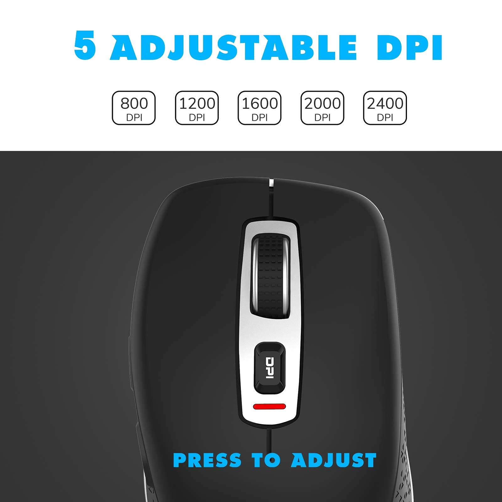 Wireless Mouse 2.4G Noise-Free Cordless Mouse 5 Adjustable DPI (up to 2400) 6 Buttons Portable Computer Silent Mouse with USB Nano Receiver, Suitable for Laptops Computers Macs Laptops (Black) 【Portable Size & Noiseless Mouse】Size: 4.57x2.8x1.85inch. Slim portable design make it easy to store in bag for traveling. Responsive buttons provide very soft click with less noise, no more disturbing for others with the loud clicking sound. Note: scroll wheel is non-silent. 【5 Adjustable DPI】 800,1200,1600,2000,2400 DPI(Default 1200), easily change the cursor sensitivity depending on your activity. In addition, wireless computer mouse makes it convenient for both left and right hands users. 【Efficient Wireless Transmission】Plug and Play, powerful, reliable 2.4GHz wireless mouse connection with high anti-interference performance with 50ft/15M transmission distance. 【Longer Lifespan】Wireless mouse passed 5,000,000 times keystroke test to guarantee extra durability. Switch button on the back of this wireless laptop mouse to save power. And it will enter sleep mode after 10 minutes of no-operation. Press any button to wake it up. Note: powered by 1 * AA battery (not included). 【Widely Compatibility】Wireless mouse well compatible with Windows XP, Windows 7/8/10, Windows Vista, Mac OS X 10.4. Wireless mouse for chromebook, laptop, desktop, notebook and macbook. Note: The wireless mouse is connected via a USB receiver. If you want to use it with a device that only has Type C port, you need to purchase an additional USB-C adapter.