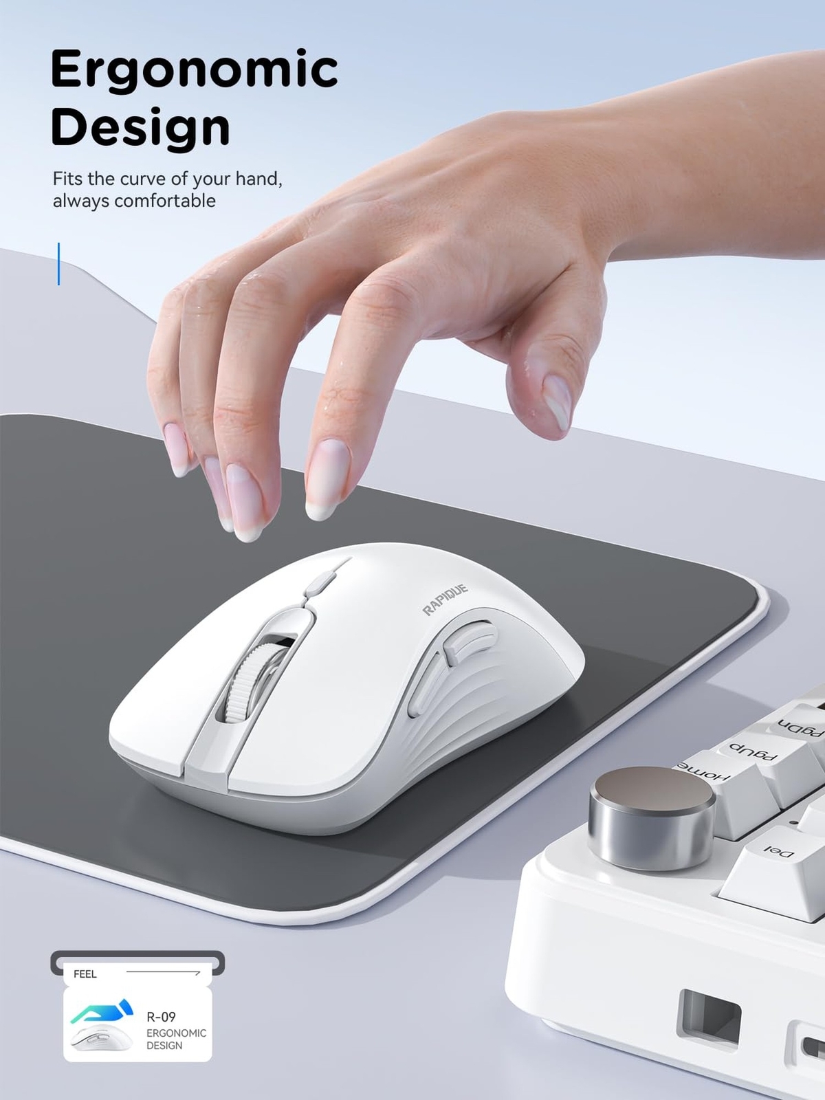 Wireless Mouse - Dual Bluetooth & 2.4 GHz USB Receiver, Ergonomic Design, Quiet Clicks, Low Power - Multi-Device Compatibility for Laptop, Computer, iPad, MacBook, Chromebook (White and Grey) Product Details Color: White and Grey Brand: RAPIQUE MPN: R-09 UPC: Does not apply EAN: Does not apply Brand: RAPIQUE Color: White and Grey Connectivity Technology: Bluetooth, USB Special Feature: Dual Bluetooth+USB, Portable, Lightweight, Ergonomic Design, Soundless Movement Detection Technology: Optical Package Dimensions: 4.61 x 3.15 x 1.65 inches Item Weight: 2.29 ounces Item model number: R-09 Batteries: 1 AA batteries required. Date First Available: September 30, 2024 Manufacturer: RAPIQUE Country of Origin: China Elegant Color Palette: The R-09 Bluetooth Wireless Mouse boasts a refined design with a pristine white button and light gray frame, complemented by a sleek white scroll wheel. This sophisticated color combination enhances any workspace with a touch of modern elegance Dual Bluetooth & USB Wireless Mouse: The RAPIQUE Wireless Mouse features both dual Bluetooth and USB connectivity options, allowing seamless switching between multiple devices like laptops, iPads, PCs, and MacBooks Ergonomic Design for Comfort: Designed with your comfort in mind, the ergonomic shape of this mouse ensures a comfortable grip for extended use, significantly reducing hand fatigue during long working hours Quiet Clicks for Distraction-Free Work: Enjoy a peaceful workspace with our silent-clicking technology, making this mouse ideal for quiet environments, whether at home or in the office Low Power Consumption: Powered by a single AA battery, this mouse boasts low power consumption, ensuring longer usage between battery changes and efficient performance Wide Compatibility: The RAPIQUE Wireless Mouse offers broad compatibility with various operating systems, ensuring reliable performance whether you're using it with a laptop, iPad, MacBook, or Chromebook Note:1. 2.4Ghz USB mode is plug and play; 2. In Bluetooth mode, long press the mode switch button to pair with Bluetooth.