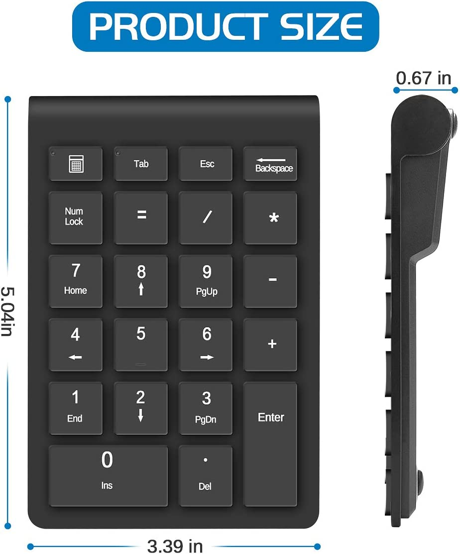 1.22-Keys Number Keypad: Numeric Keyboard supports NumLock, ESC, Tab, Delete etc. With shortcut key which can open the computer calculator directly. The Muli-Function 22 Keys Wireless external number keypad for laptop is more unique than most keyboards. 2. Portable And Easy To Use: Our Number Pad is only 87g. And Numeric Keyboard is work by 2.4GHz wireless technology, Plug and Play. You can just plug the receiver into a USB port . No device drivers needed, no delays and dropouts, fast data transmission. The maximum working range up to 32.8 ft.The Receiver is inserted in the battery compartment of the keyboard 3. Mute And Touch Comfortable: Made of high quality ABS Material which offer great comfortable touch and precise control, good resilience fast response and reduce the press sound. It also has auto sleep function, lower power consumption, reflect energy saving. Press any key to awake up the keypad. Power Supply by 2 x AAA Battery ( not included ) 4. Multi-Compatibility: Foloda Wireless numeric pad works with PC, laptop and desktop computers that have Windows 2000 / XP / Vista / 7 / 8 / 10 systems. 5. Customer Service: Foloda specialized in Home and try our best to offer the better product and customer service.If you have any quesiton, feel free to contact with us. Product Description Foloda Number pads is made of high quality ABS material which offer great comfortable touch and precise control, good resilience fast response and reduce the press sound. It also has auto sleep function, lower power consumption and reflect energy saving. You can press any key to awake up the keypad. 22-Keys Wireless Number Pads Specifications: Keys : 22 keys Color : Black Weight : 87 g / 0.2 LB Item Dimensions : L x W x H : 12.5 x 9.5 x 2.5 CM / 5.31 x 3.74 x 0.99 inches System Support : Windows XP, Windows Vista, Windows 7 / 8 / 10 ( Not compatible with Mac OS ) Numeric Keyboard supports NumLock, ESC, Tab, Delete etc. With shortcut key which can open the computer calculator directly. The Muli-Function 22 Keys Wireless external number keypad for laptop is more unique than most keyboards. Foloda Wireless Numeric Pad works with PC, Laptop and Desktop Computers with Windows 2000 / XP / Vista / 7 / 8 / 10 Systems. But Not compatible with Mac OS . Application Scenario Easy to install and use. Just one USB receiver can connect the wireless number pad to your computer. Compact and Portable Our Number Pad is only 87 g. And Numeric Keyboard is work by 2.4 GHz wireless technology, Plug and Play. Take wherever you want with your handbag and backpack. Comfortable and Good Sense for Use Made of high quality ABS Material which offer great comfortable touch and precise control, good resilience fast response and reduce the press sound. X-type scissors foot structure offer comfortable and good sense for use. Add to Cart Add to Cart Add to Cart Add to Cart Add to Cart Customer Reviews 4.4 out of 5 stars 4,935 4.2 out of 5 stars 858 4.0 out of 5 stars 86 4.4 out of 5 stars 4,935 4.4 out of 5 stars 4,935 4.1 out of 5 stars 222 Price $18.79 $ 18 . 79 $19.99 $ 19 . 99 — $18.79 $ 18 . 79 $18.79 $ 18 . 79 $32.99 $ 32 . 99 Bluetooth NO ✓ ✓ NO NO ✓ USB Required ✓ NO ✓ ✓ ✓ NO Rechargeable NO NO ✓ NO NO ✓ Battery Type 2AAA Batteries required 2AAA Batteries required Lithium Battery AAA Batteries required AAA Batteries required Lithium Battery Compatibility Windows,Android Windows,Android Mac OS,Windows,Android Windows,Android Windows,Android Mac OS,Windows,Android Weight 0.19 lb 0.19 lb 0.37 lb 0.19 lb 0.2 lb 0.28 lb Size 5.31 * 3.54 *0.2 inches 5.31 * 3.54 *0.2 inches 7.68 x 6.69 x 1.22 inches 5.31 * 3.54 *0.2 inches 5.11*3.31*0.55 inches 5.79 * 4.53 * 0.39 inches