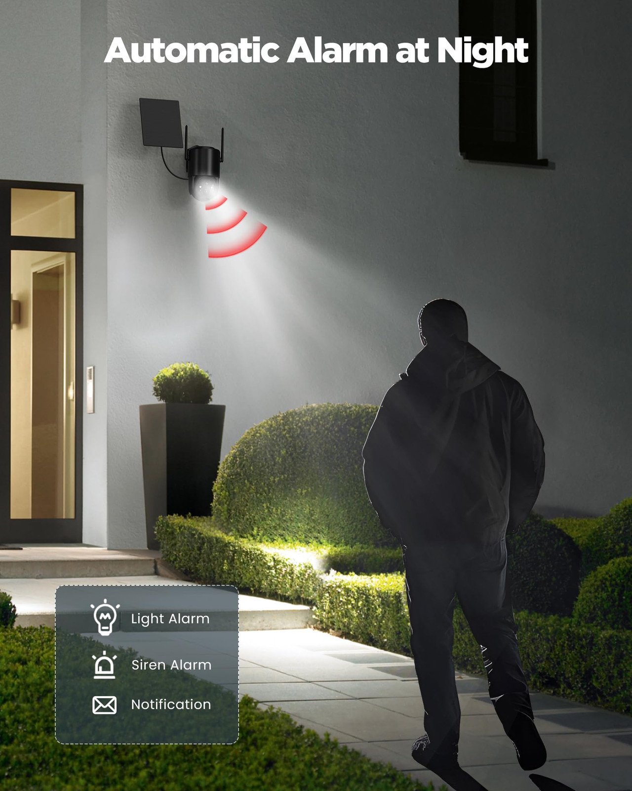 【360° Rotating & 2K Color Night Vision】Security cameras wireless outdoor can rotate its head 350° horizontally and 115° vertically. Equipped with 2 infrared LEDs, 3MP FHD resolution (2560*1440), 110° viewing wide-angle, the outdoor camera wireless allows you to remotely shoot and watch up to 65ft range of clear pictures and videos. How a nice camera for home security! 【Alarm Light & Sound】You can set the wireless camera outdoor to emit a harsh alarm sound to drive away intruders or unwanted small animals. The outdoor camera wireless can automatically emit a sound when triggering a motion alarm. You can also say what you want by manually pressing the microphone icon in the app. While letting the camera automatically sound an alarm, please be aware if it will affect your neighbors. Your home security system. 【Solar Powered Wireless Battery】Our solar cameras for home security eliminates the need for cables, making it easy to install and use. This wireless rechargeable battery camera can operate continuously as long as there is sunlight to provide the necessary electric power. Enjoy uninterrupted home security with our surveillance security cameras. 【Eliminate Tedious Charging Steps】The solar camera is equipped with a solar panel and a powerful lithium battery, which allows it to be charged by solar energy during the day and powered by the battery at night, never worrying about low battery. Let you completely avoid the trouble of climbing a ladder to remove the outdoor camera for charging. 【Multifunctional Wireless Security Camera Outdoor】IP65 waterproof, sound and light alarm, PTZ 360° coverage, ensuring that you can always keep track of your home situation and protect your property safety. If you encounter any problems during use, please contact us at anytime. We will provide you with satisfactory service.