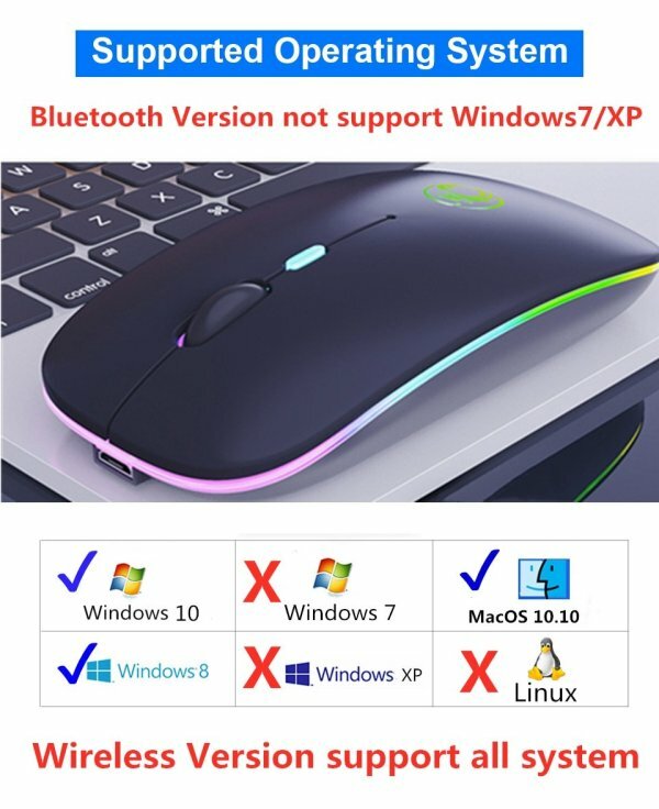 Wireless Mouse RGB Bluetooth 5.0 Mouse Computer Mouse Ergonomic Silent Mause Rechargeable Luminous Optical Mice For PC Laptop $23.79 AE_4001039384128 Description Wireless Mouse RGB Bluetooth 5.0 Mouse Computer Mouse Ergonomic Silent Mause Rechargeable Luminous Optical Mice For PC Laptop Item Name:Wireless RGB Wireless Mouse Buttons: 4 buttons Ajustable DPI Switch: 800 / 1200 / 1600DPI WiFi Range: 10M Battery: Rechargeable Charging Cable Length: About 60cm Switch Life: 10 M illion T imes Size: 112 *57 *20mm Support System: Windows / Mac(RGB Bluetooth mouse does not support windows 7 /windows xp system) User for: Computer Office
