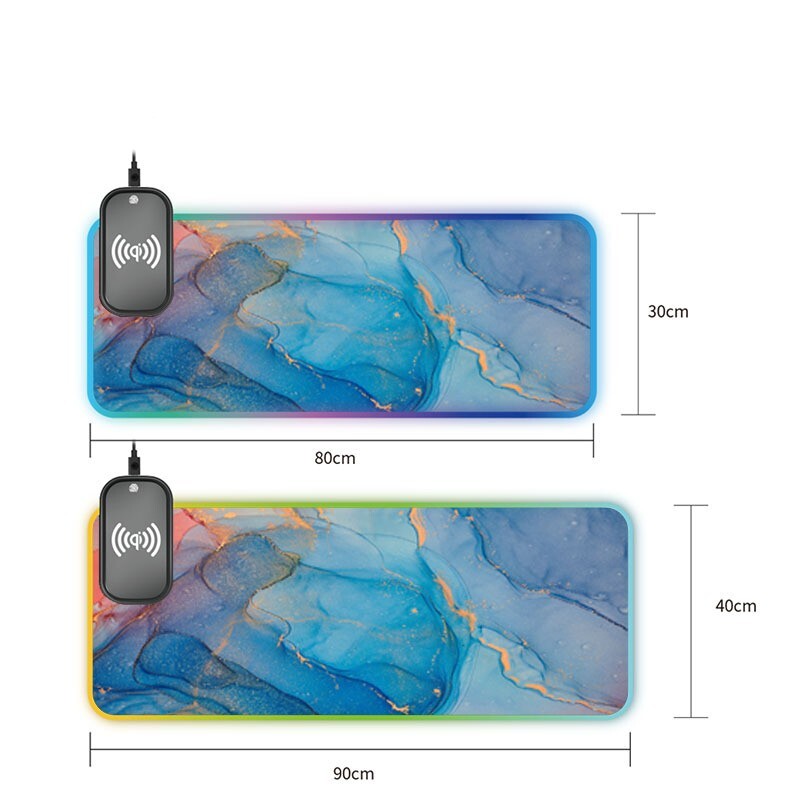 1.Wireless Charging Mouse Pad : The RGB gaming mouse pad has a built-in 15W wireless charging function that can quickly help you charge your phone when it runs out of power, compatible with smartphones that support wireless charging. 2.Cool RGB lighting modes : The wireless gaming mouse pad has different lighting modes to provide a unique atmosphere when playing games or working, you can turn off the lights as needed, and the shiny RGB lighting performs better when used in dark environments. 3.Waterproof and anti-slip : Large mouse pad is woven with microfiber, which can precisely control the pixel positioning and tracking of the mouse, the surface contains waterproof coating, when liquid spills on the mouse pad, it will form water droplets to slide off. 4.Gaming Mouse Pad : Customized for gamers, the RGB mouse pad is designed with a non-slip rubber base that will not follow the movement of the mouse and keyboard, keeping the stability of the desktop and optimizing your gaming experience. 5.Simple design : The mouse pad is big enough to hold your keyboard, mouse and headset, perfectly fit for any operation, no need to worry about the lack of space. 6.Wireless Charging Mouse Pad Is compatible with smartphones that support wireless charging, such as iPhone 8/X/XR/XS/11/11 Pro, Samsung Galaxy 10/S9/S8 Plus, Galaxy Note 9/8, and all other devices that support Qi . Package: 1x RGB gaming mouse pad 1x usb charging cable
