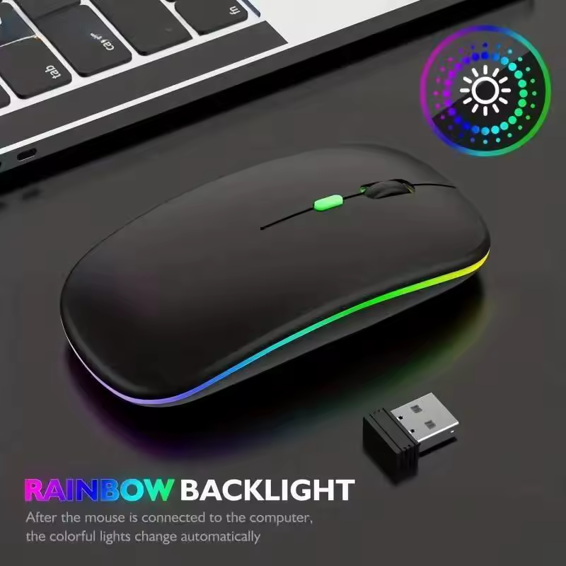 • Wireless 2.4Ghz Connection : Experience seamless computing with the wireless mouse, designed to deliver a 2.4Ghz connection for smooth and reliable performance. • RGB Backlight : This mouse features an RGB backlight, adding a stylish touch to your computing experience while also providing visibility in dark environments. • Rechargeable Battery : The wireless mouse is powered by a rechargeable battery, ensuring long-lasting use and reducing the need for frequent charging. • Ergonomic Design : With its ergonomic design, this mouse provides comfortable grip and reduces hand fatigue, enhancing your computing experience. • Laser Operation Mode : The laser operation mode of the wireless mouse ensures precise cursory movement, making it ideal for gaming, work, or internet surfing. • Right-Hand Orientation : Designed for right-hand users, this mouse offers intuitive operation and improved efficiency for right-handed users. Number of keys: 4 keys Working distance: 10M Material used: ABS DPI: 800/1200/1600 Product weight: 70g Wireless Mouse size: 112*58*25mm Product Features: Ergonomic Button service life: 5 million times Battery Type: Built-in 500mAh battery Connection method: Bluetooth connection / 2.4GHz wireless connection Color:black,Silvery 2.4G compatible system: all computers with USB interface can be used Bluetooth 3.0 compatible system: Windows 7/8/10/XP, Android 3.0, Mac & IOS 10.X, Chrome Bluetooth 5.2 compatible system: Windows 8/10, Android 4.2 and above, Mac & IOS 10.10 (Compatiable with 4.2BLE, 4.1BLE, 4.0BLE or earlier) Note: The mouse version;Single mode without lamp,Dual mode with lights, The price is different, the product is different, Please allow 1-2cm errors due to manual measurement Item color displayed in photos may be showing slightly different on your computer monitor since monitors are not calibrated same Note: The mouse version;Single mode without lamp,Dual mode with lights, The price is different, the product is different, Please allow 1-2cm errors due to manual measurement Item color displayed in photos may be showing slightly different on your computer monitor since monitors are not calibrated same