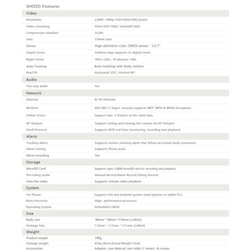Wireless Security Camera WIFI 1080P HD Smart APP Night Vision 2-Way Audio Home Description: Model: Wireless WIFI MINI IP Camera Day/Night: IR-CUT Auto Switch Filter Digital Noise Reduction: 3D Digital Noise Reduction Frame Rate: 25fps± internet adaptively adjustment Support System: IOS, Android, Windows PC, Tablet etc 1080P: 1080P(1920*1080), 2.0 MP, 3x digital zoom,3.6mm Lens, H.264 Audio :Built-in Mic & Speaker. Supports two-way audio, Easily communication TF Card: Support max 128GB TF card for recording and playback. (Not Included) AP Hotspot: Support setting and viewing the camera via AP Hotspot. Alarm: Support Motion detectioin alarm, Phone push alarm WiFi Setting: Support set Wi-Fi via QR Code, easy to use than ever. Tracking Alarm : Support motion tracking alarm that follow up human body movement Privacy Protection: System defaults the first user as administrator, other users accessing the camera need administrator's authorization, otherwise they can't view it. General Function: Reverse, Capture, Recording, Motion detection, Alarm, IR Auto, Password protection, Video playback, Remote control,Two way intercom audio, One Button Guarding, Browser view, Adiministrator and guest setting,etc Package include: 1 x Security IP Camera 1 x Hanging Plate 1 x Network Cable 1 x USB Cable 1 x Power Supply 1 x Screw Set 1 x Instruction