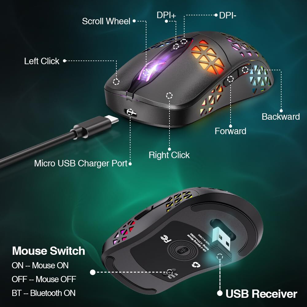Ratón de juego inalámbrico para computadora portátil PC OL Features: Carcasa ligera en forma de panal: nuestro diseño ligero de carcasa en forma de panal mejora la experiencia táctil y la durabilidad. Cuenta con ventilación avanzada para una mayor comodidad de la palma y permite un movimiento rápido y libre durante el juego, lo que garantiza largas sesiones de juego sin fatiga. 3 modos: BT5.0/BT3.0/2.4GHz: cambia fácilmente entre los modos 2.4GHz y Bluetooth. Haz clic en el botón "BT" para conectar el mouse a tu dispositivo o presiona el botón "ON" para la funcionalidad de 2.4GHz. Ten en cuenta que la batería baja puede provocar un movimiento del cursor lento, inestable o que no responda. Se recomienda cargarlo a tiempo. El mouse funcionará normalmente cuando esté completamente cargado. Luces Chroma RGB: simplemente haz clic en el botón "DPI -" para recorrer 4 efectos diferentes para la retroiluminación RGB: modo arcoíris, modo de transmisión, modo respiración y modo puro. También puedes apagar el RGB si lo deseas. Estas opciones agregan un nivel adicional de disfrute a tu experiencia de juego. 4 DPI ajustables y botones flexibles: con 4 configuraciones de DPI ajustables que van desde 600 a 1600, tiene la flexibilidad de controlar la velocidad según sus preferencias. El receptor USB se puede conectar directamente a la interfaz USB sin necesidad de controladores o software adicionales. El mouse está equipado con 7 botones: botón izquierdo, botón derecho, adelante, atrás, botones DPI +/- y una rueda de desplazamiento para una funcionalidad mejorada. 🌻 If you need more quantity than shown available - just send me a message and I'll increase the purchased limit for you 🌻 SHIPPING We are always working hard to ensure your package arrives as soon as possible. Please understand that some factors like weather, high postal traffic, and the performance of shipping companies are outside of our control. We offer free shipping to the lower 48 states. We do not accept P.O. Boxes. Please provide a physical address. Thank you 🌻 TRANSLATE with x English Arabic Hebrew Polish Bulgarian Hindi Portuguese Catalan Hmong Daw Romanian Chinese Simplified Hungarian Russian Chinese Traditional Indonesian Slovak Czech Italian Slovenian Danish Japanese Spanish Dutch Klingon Swedish English Korean Thai Estonian Latvian Turkish Finnish Lithuanian Ukrainian French Malay Urdu German Maltese Vietnamese Greek Norwegian Welsh Haitian Creole Persian
