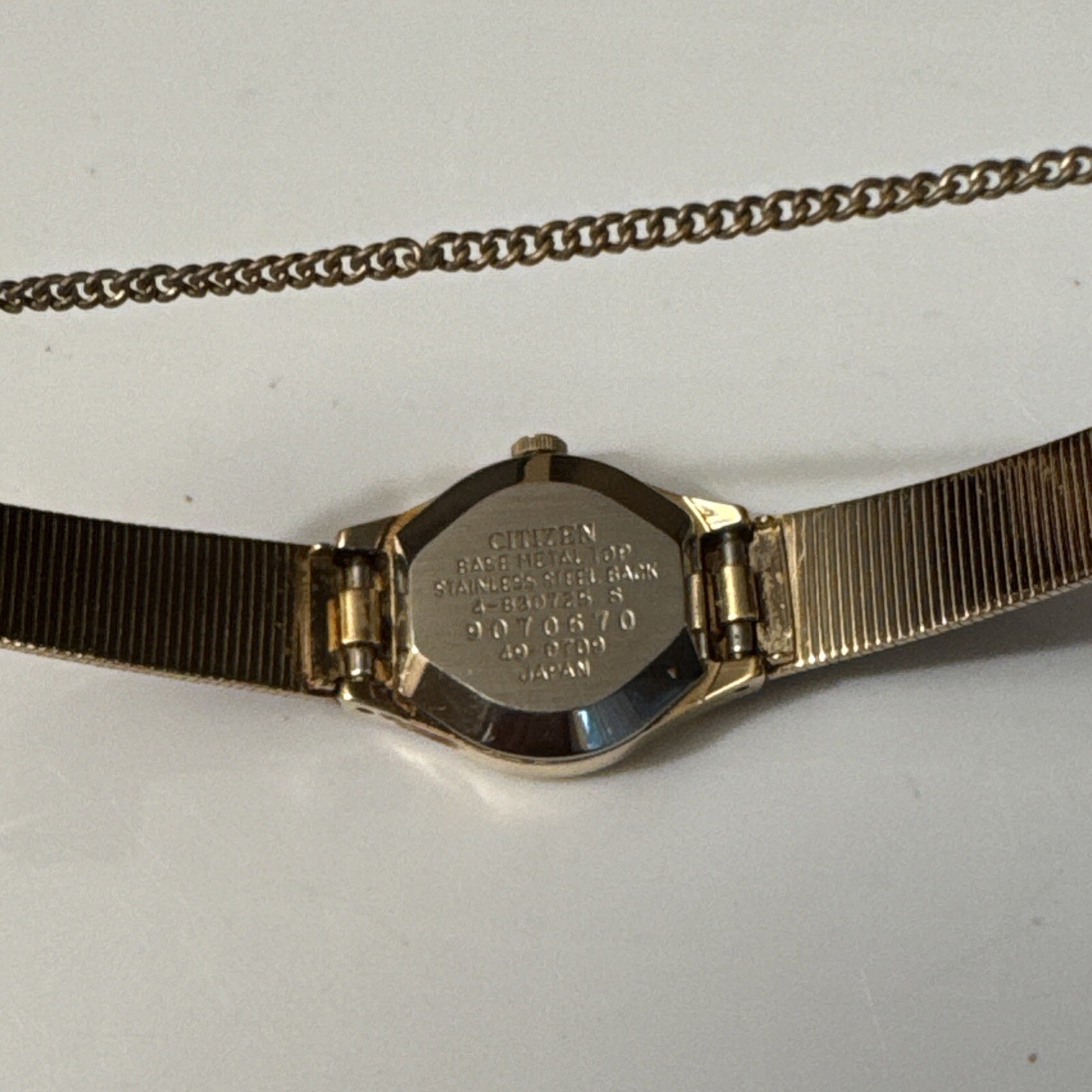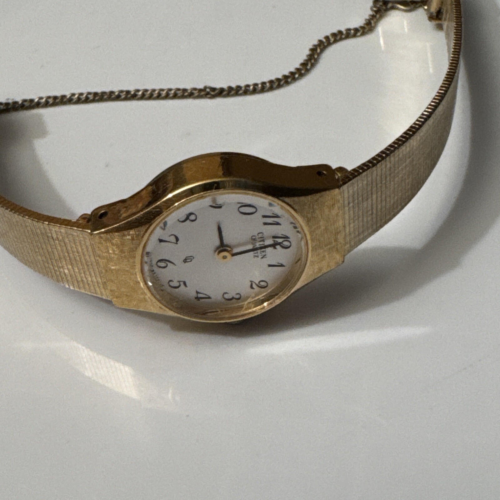 This Women's Gold Citizen Quartz Watch is a vintage timepiece with a classic design suitable for any occasion. The watch features a gold case and band with an ivory dial, creating a stylish and elegant look. With its analog display and quartz movement, this Citizen Vintage model offers both functionality and timeless style for the modern woman. Needs battery not tested