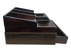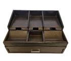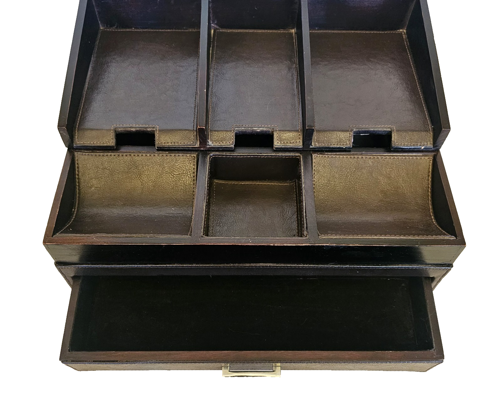 Organizer Charging Station for cell phones.Place on a desk, a Dresser, bedside table. Nice Valet piece made of Wood and faux Leather. w Drawer 13" x 10" x 6" This nice looking station has a lift up section to keep cords away below out of site with a hole in the back for them to plug into outlets. There are three sections in the front for change, keys, etc. There is a pull out drawer for jewelry, watches, pens, you name it. There is normal wear as this was gently used.