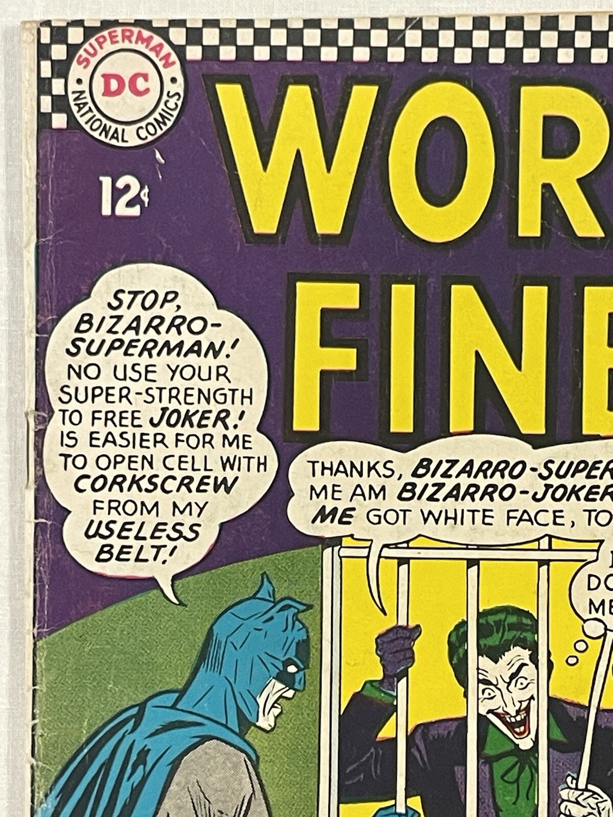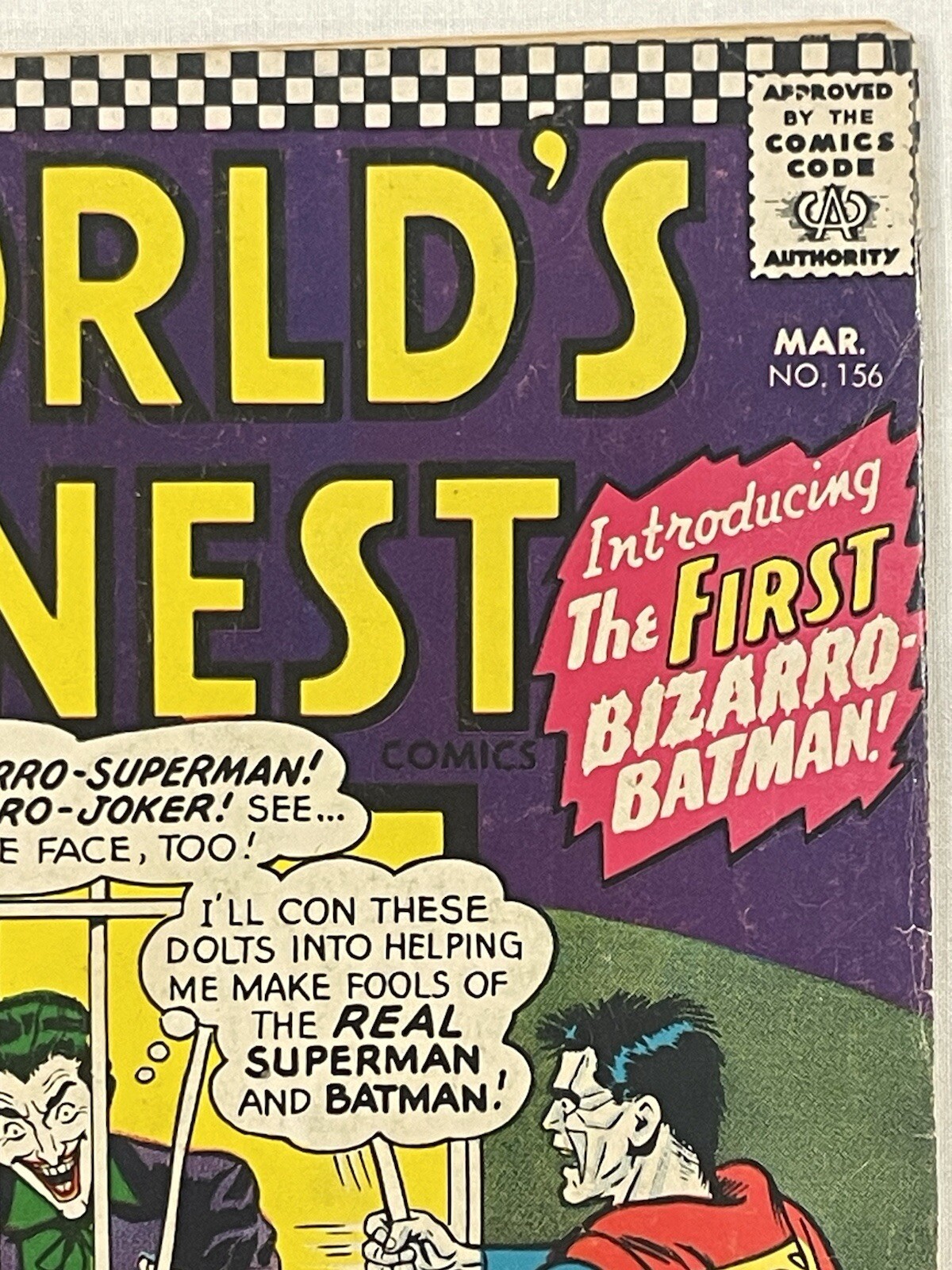 Issue Number:156Era:Silver Age (1956-69)Tradition:US ComicsPublisher:DC ComicsCover Artist:Curt Swan, Sheldon MoldoffLanguage:EnglishArtist/Writer:Edmond Hamilton, George Klein, Henry Boltinoff, E. Nelson Bridwell, Curt Swan, Otto Binder, Jim MooneyPublication Year:1966Series Title:World's Finest ComicsCharacter:Bizarro Batman, Colonel Tommy Tomorrow, Captain Brent Wood, Dick Grayson, Bizarro, Batman (Bruce Wayne), Jimmy Olsen, Tur-Tel, Vicki Vale, Joker, Super-Turtle, Bizarro Batman (Introduction), Superman (Clark Kent), RobinGenre:Superheroes, Humor/Satire, Funny Animal, Science Fiction