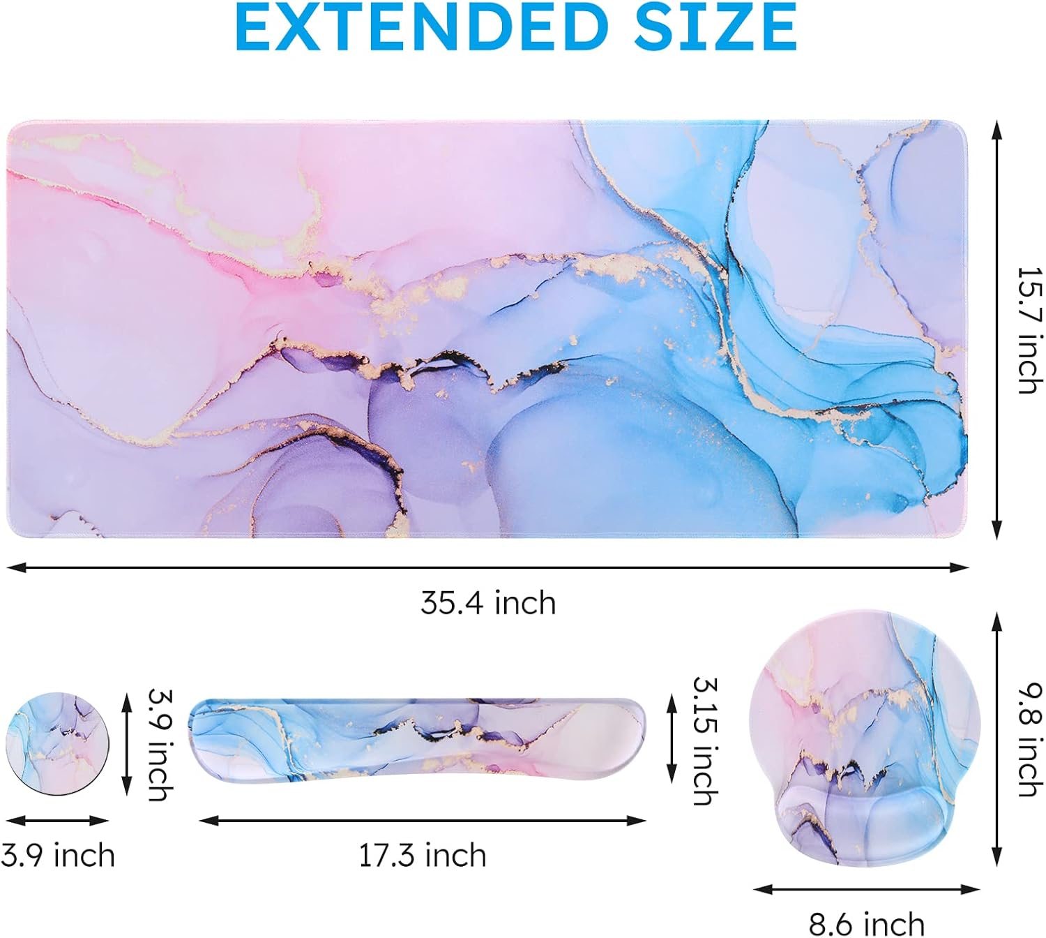 【Large Mouse Pad Size】Extended mouse pad:35.4" x 15.7",wrist rest for computer keyboard:17.32" x 3.15" x 0.98",wrist rest for mouse:8.66" x 9.84" x 0.86",Coaster:3.93" x 3.93". 【 Ergonomic Design】Ergonomic mouse pad with wrist rest fits the wrist perfectly, the keyboard wrist rest and mouse wrist rest can provide a good touch and effective support for your wrist, keep your wrist and hand relaxed, and reduce the stress of using computer and office for a long time wrist discomfort and soreness. 【Ultra-smooth Surface & Non-slip Base】With Comfortable Lycra Surface and Breathable Material to the desk pad. Making your mice glide on its surface effortlessly, which can provide optimum speed and accurate control during your working or gaming.0.65 in (2 mm) thickness at such an expansive size provides the stability you need for both mouse and keyboard. 【 Water-resistant & Washable Surface】Long mouse pads for desk with a spill-proof coating makes liquids slide right off the surface. Effectively prevent damage from spilled drinks or other accidents. You can easily clean any dirt with a damp cloth. 【 Widely Usage】This combo can be used in many ways. The desk mats on top of desks can be used as a great desk organizer making your desktop neat. As a keyboard and mouse pad for you to gaming and work. As a home and office decor with a beautiful pattern. Product Description XXL Gaming Mouse Pad Add to Cart Add to Cart Add to Cart Add to Cart Add to Cart Customer Reviews 4.8 out of 5 stars 8,432 4.8 out of 5 stars 8,432 4.8 out of 5 stars 8,432 4.8 out of 5 stars 8,432 4.8 out of 5 stars 8,432 4.8 out of 5 stars 8,432 5.0 out of 5 stars 9 Price $18.99 $ 18 . 99 $17.99 $ 17 . 99 $17.99 $ 17 . 99 $18.99 $ 18 . 99 — $18.99 $ 18 . 99 — Ultra-smooth Surface ✔ ✔ ✔ ✔ ✔ ✔ ✔ Stitched Edges ✔ ✔ ✔ ✔ ✔ ✔ ✔ Non-slip Base ✔ ✔ ✔ ✔ ✔ ✔ ✔ XXL Large Size ✔ ✔ ✔ ✔ ✔ ✔ ✔ Washable ✔ ✔ ✔ ✔ ✔ ✔ ✔ Keyboard Wrist Rest Mouse Pad Set Add to Cart Add to Cart Add to Cart Add to Cart Customer Reviews 4.7 out of 5 stars 10,561 4.7 out of 5 stars 10,561 4.7 out of 5 stars 10,561 4.7 out of 5 stars 10,561 — — — Price $15.99 $ 15 . 99 $17.99 $ 17 . 99 $8.99 $ 8 . 99 $8.99 $ 8 . 99 — — — Ergonomic Design ✔ ✔ ✔ ✔ ✔ ✔ ✔ Memory Foam ✔ ✔ ✔ ✔ ✔ ✔ ✔ Non-slip Base ✔ ✔ ✔ ✔ ✔ ✔ ✔ Skin-friendly ✔ ✔ ✔ ✔ ✔ ✔ ✔ Washable Surface ✔ ✔ ✔ ✔ ✔ ✔ ✔