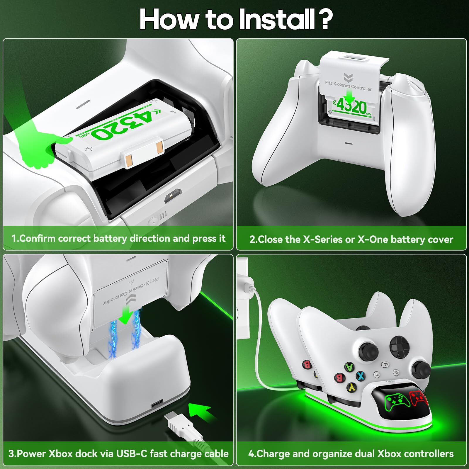 Specially designed for Xbox Series/Xbox /Xbox Elite controllers:This Xbox controler charging staion comes with 2 rechargeable 4320mWh batteries that are with Xbox Series X/S, Xbox X/S/ Xbox /Xbox Elite controllers. Long-lasting and high capacity rechargeable battery: convenient to avoid buying AA batteries and the 2 batteries are rechargeable up to 3000 times and fully recharge in 2.5 hours and with a battery life of up to 20 hours per charge. This Xbox battery and charger kit lets you charge while you play or after your game. LED indication charging in progress or charged: This Xbox Series X/S Xbox X/S dual controller docking station is equipped with LED indicators to know the charging status: Red light while charging your controller and then green at the end of it. Safe and easy to use: Built-in smart chip to protect against overcurrent, overheating, over voltage and short circuits. The Xbox Controller Charger comes with multiple covers for the back of the controller depending on the version of your controller (for Xbox / Series). Package Contents: 1 x Xbox Controller Charging Dock, 2 x Rechargeable Batteries, 4 x Battery Covers (2 for Xbox Series and 2 for Xbox ), 1 x USB Cable (80 cm), 1 x User Manual.
