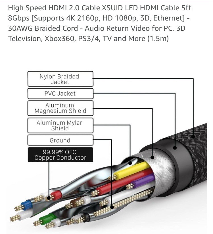 Brand XSUID - 24k gold plated Cable type Ethernet Compatible devices Personal Computer Special feature Braided, High Speed. Supports 4K 3D resolution and utilizes a high-purity 30AWG Oxygen-Free Copper (OFC) conductor for optimal signal quality. Connector gender Male-to-Male Data transfer rate 18 Gigabits Per Second Multi-functional HDMI :supports Ethernet, 3D, 4K video and Audio Return Channel (ARC) and hot plugging,2.0standard equipment, and compatible with v1.4 and v1.3 standards,can achieve multi-purpose HDMI Multi-device Universal: this product allows you to share an Internet connection among multiple devices. it can connects your TV to your Blu-ray players, Fire TV, Apple TV, PS4, PS3, Xbox one, Xbox 360, computers and other HDMI-enabled devices to TVs, displays, A/V receivers and many more. High Speed and Stability Transmission : HDMI 2.0 line, 18 Gbps/4K video, 60 Hz, 2160p, 1080p, 48 bit deep color. Gold-plated connectors and durable PVC outer layer to prevent external interference, provide more realistic sound and image. Flexibl and Durable HDMI Line: High durability and soft and flexible HDMI cable, PVC outer layer, which means it can withstand bending test, and high quality materials to prevent serious wear and tear to maintain long-term use