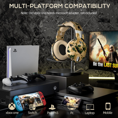 YINSAN Gaming Headset for Xbox One, PS4 Headset with Mic, Stereo Surround Sound, Noise Cancelling Microphone & One-Key Mute, Cool Camo Gaming Headphones for Nintendo Switch PS5 PC Product Details Brand: YINSAN Color: Camouflage Form Factor: Over Ear Connectivity Technology: Wired Special Feature: Surround Sound, Ergonomic, Noise Cancellation 【Superior Surround Stereo】This camouflage ps4 headset features precision 50mm Audio Drivers combined with advanced audio techniques bring you high quality 360° simulated surround sound lets you feeling the movement of enemies at any time, immerse yourself in your favourite games. 【Noise Cancelling & Adjustable Microphone】The microphone of this PS5 headset with high sensitivity has built-in IC noise reduction chip, filters most ambient noise in environment. The 120° flexible adjustable mic is better to pick up your voice loud and clear, so you can easily communicate with your teammates in the game. 【Multi-Platform Compatible】YINSAN TM-5 Camo gaming headset suitable for all 3.5mm interface devices. Supports PS4, PS5, Xbox One, Xbox One X/S, Switch, PC, Laptop, Tablet, Phone. Kindly Notes: Old Xbox One requires a microsoft adapter (Not Included). 【Over-Ear Gaming Headphones Designed for Comfort】This Xbox headset with lightweight + soft protein leather + breathability memory foam pads + adjustable headband design, feel comfy fit and painless even long time gaming. Immersed in the game world, couldn't let pain wake you mind.