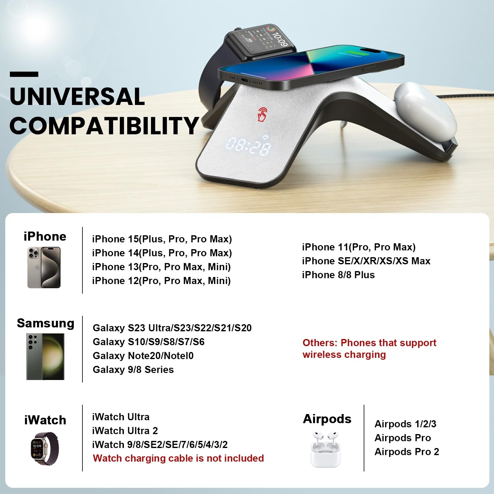 YLF Fast Wireless Charger Station 5 in 1 with Adapter - Wireless Phone Charger Stand with LED and Bluetooth Clock for Samsung Galaxy S23 Ultra/S23/S22/S21(Grey) Product Details Color: Grey Brand: YLF MPN: YLF-S01 UPC: Does not apply EAN: Does not apply Brand: YLF Connectivity Technology: USB Connector Type: USB Type C Compatible Devices: Compatible with iPhone 15 Pro Max / 15 / 15 Pro /14 Pro Max / 14 / 14 Pro / 14 plus /13 Pro Max / 13 / 13 Pro / 13 mini / 12 Pro Max / 12 / 12 Pro / 12 mini / 11 Pro Max / 11 / 11 Pro / Xs Max / X / Xs / XR / 8 Plus / 8 / SE (2) See more Compatible Phone Models: Apple Watch 8, Apple Watch series 7, Apple Watch 6, Apple Watch 5, Apple Watch 4, Apple Watch series 3, Apple Watch 2, Apple Watch SE; AirPods Pro, AirPods Pro 2, AirPods 3rd generation, AirPods 2, Samsung Galaxy Buds, Samsung Galaxy Buts+, Samsung Galaxy Buds Pro, Samsung Galaxy Buds Live, Samsung Galaxy Buds2;, iPhone15, iPhone 15 pro, iPhone 15 pro max,iPhone14, iPhone 14 pro, iPhone 14 pro max, iPhone 14 plus, iPhone 13, iPhone 13 pro, iPhone 13 pro max, iPhone 13 mini, iPhone 12, iPhone 12 pro, iPhone 12 pro max, iPhone 12 mini, iPhone 11, iPhone 11 pro, iPhone 11 pro max, iPhone 11 mini, iPhone Xs, iPhone Xs Max, iPhone X, iPhone XR, iPhone XR, iPhone 8, iPhone 8 plus, iPhone SE, Samsung Galaxy S23,Samsung Galaxy S22 Ultra, Samsung Galaxy S22 Plus, Samsung Galaxy S22, Samsung Galaxy S21 Ultra, Samsung Galaxy S21 Plus, Samsung Galaxy S21, Samsung Galaxy S20 Ultra, Samsung Galaxy S20 Plus, Samsung Galaxy S20, Samsung Galaxy S10 Plus, Samsung Galaxy S10 5G, Samsung Galaxy S10, Samsung Galaxy S10e, Samsung Galaxy S9, Samsung Galaxy S9 Plus all devices. See more Included Components: Apple 5-in-1 wireless charger, 20W adapter, dual Type-C charging cables, wireless charging instructions See more Special Feature: Magnetic, Fast Wireless Charging, Wireless Charging Color: Grey Input Voltage: 9 Volts Mounting Type: Tabletop Mount Product Dimensions: 7.87 x 7.87 x 2.55 inches Item Weight: 8.3 ounces Item model number: YLF-S01 Date First Available: October 24, 2023 Manufacturer: YLF Country of Origin: China 15W Fast Wireless ChargerThis 5-in-1 wireless charging station provides fast and efficient charging for your mobile phone, saying goodbye to cluttered wires on your desk. 7 Colors LED LightThis fast charging wireless charger stand is equipped with a stylish LED light that allows you to switch between seven different colors to add ambiance to your workspace or bedroom. Bluetooth ClockYLF wireless charging station has a Bluetooth clock function, you only need to connect your phone to calibrate the time. NoteThis product does not have an alarm clock function. 15W Wireless Charger Compatibility 5-in-1 wireless charger has four powers of 15W/10W/7.5/5W, suitable for iPhone15/14/13/12/11/X/XR/XS /8/SE3/SE2, iPhone Pro 15/14/13/12/11, iPhone Pro Max 15/14/13/12/11/XS, iPhone Plus 15/14; Samsung Galaxy S23 Ultra/S23/S22/S21 and other Qi protocol compatible devices . Safe Wireless Charging Stand Our 5-in-1 wireless charging station has passed FCC certification and has over-temperature, over-current, and short-circuit protection to ensure that the device battery is not damaged by overcharging. The wireless charger has a non-slip pad on the bottom , more stable to use. Space-saving DesignThe compact and ergonomic design of this wireless charger makes it a perfect fit for any environment. Its integrated stand allows you to charge your phone in both portrait and landscape orientations, making it ideal for watching videos, making video calls, or using your phone while it's charging. Packaging and ServiceThe package contains an Apple 5-in-1 wireless charger, a 20W adapter, dual Type-C charging cables and wireless charging instructions. We provide 90 days of free replacement service and 24-hour online service. If you encounter any problems during purchase, please feel free to contact the YLF team.