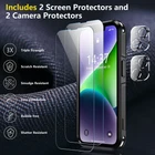 [Designed for]: case designed for iPhone 14 case/iPhone 15 case (6.1 inch). Precise cutouts for easy access to all ports, buttons, sensors and cameras. Soft and sensitive buttons with good response, are easy to press. Wireless charging is also supported through the case. [Thorough Screen & Camera Lens Protection]: Raised lips protecting iPhone 14/iPhone 15 screen and camera lens thoroughly. 1.5mm raised lips over screen and 1.5mm raised lips over camera relieves impact and protects the iPhone screen and camera against drop damage, cracks and scratches. Reinforced corner effectively absorb bumps from any angle drop. [Skin-friendly Material & Comfortable Grip]: The unique ergonomic design provides a cozy grip of the iPhone. Anti-scratched and anti slip premium frosted material solved the problems of leaving fingerprints and marks. This case can totally achieve a great grip feeling also stay clean, no slip and anti-scratched. [Full Protection]: Passed Military Drop Tested up to 15 FT. 2-Layer structure provides 360°full body rugged protection. This case is made with flexible rubber inner cover and hard polycarbonate back cover, provides good shockproof and anti-drop damage protection. Plus 2 tempered glass screen protectors with high touch sensitivity prevent scratches and cracks and 2 camera protectors protects the iPhone camera. [What You Will Get]: You will get a Case, 2 pcs tempered glass screen protector and 2 pcs tempered glass camera protector. If you have any issues, please contact us and we will reply in 24 hours.
