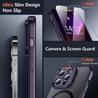 for iPhone 13 Pro Max Case, Built-in Adjustable Camera Stand, Magnetic [10 FT Military Grade Drop Protection] [2 pcs Glass Screen Protectors] Shockproof Slim Case, Translucent Matte Purple [Perfect Compatibility] SPIDERCASE designed iPhone 13 Pro Max Case, fit for iPhone 13 Pro Max (6.7 inch). Precise cutouts for easy access to all ports, buttons, sensors and cameras. Sensitive buttons with good response are easy to press.,[Super Strong Magnetic] With a built-in magnetic ring that aligns perfectly with magnetic chargers, this iPhone 13 Pro Max case offers a stronger attachment and faster charging speed. Compatible with all magnetic accessories and wireless chargers (such as car wireless charger, wireless power banks, magnetic wallets, etc).,[Flexible & Functional Camera Stand] The built-in foldable camera stand is sturdy and durable, made by hard and solid plastic, offering a sturdy and flexible support for watching videos, movies or making video calls, totally frees your hands. It also provides a well protection for the phone camera, to prevent the crack and scratches. The sturdy kickstand is durable enough for up to 5000 times of use and it is 0-180° adjustable for comfortable viewing.,[Military-grade Shockproof] This iPhone 13 Pro Max case has passed military drop tests up to 10ft, it has a tough PC back and soft flexible rubber bumpers that provide strong cushioning for everyday drops. The design of 1.5 mm bezels over the screen and cover of the camera prevents the screen and camera from dust, scratches and cracks. Plus 2 pcs HD tempered glass screen protectors to protect the phone screen.,[Skin-Friendly] The iPhone 13 Pro Max case features skin-friendly and upgraded non-slip textures on the sides. It gives you velvety touch and better grip. Stylish, elegant, and simple design, the slightly translucent back PC endows your phone with a mysterious elegance. It looks and feels better than without the case. Newly anti-fingerprint surface, away from greasy finger marks, easier to clean.