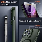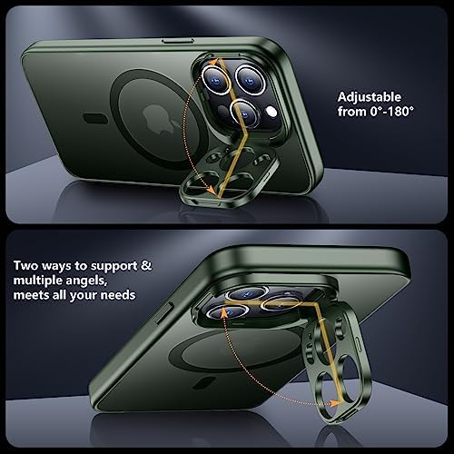 for iPhone 13 Pro Max Case, Built-in Adjustable Camera Stand, Magnetic [10 FT Military Grade Drop Protection] [2 pcs Glass Screen Protectors] Shockproof Slim Case, Translucent Matte Green [Perfect Compatibility] SPIDERCASE designed iPhone 13 Pro Max Case, fit for iPhone 13 Pro Max (6.7 inch). Precise cutouts for easy access to all ports, buttons, sensors and cameras. Sensitive buttons with good response are easy to press.,[Super Strong Magnetic] With a built-in magnetic ring that aligns perfectly with magnetic chargers, this iPhone 13 Pro Max case offers a stronger attachment and faster charging speed. Compatible with all magnetic accessories and wireless chargers (such as car wireless charger, wireless power banks, magnetic wallets, etc).,[Flexible & Functional Camera Stand] The built-in foldable camera stand is sturdy and durable, made by hard and solid plastic, offering a sturdy and flexible support for watching videos, movies or making video calls, totally frees your hands. It also provides a well protection for the phone camera, to prevent the crack and scratches. The sturdy kickstand is durable enough for up to 5000 times of use and it is 0-180° adjustable for comfortable viewing.,[Military-grade Shockproof] This iPhone 13 Pro Max case has passed military drop tests up to 10ft, it has a tough PC back and soft flexible rubber bumpers that provide strong cushioning for everyday drops. The design of 1.5 mm bezels over the screen and cover of the camera prevents the screen and camera from dust, scratches and cracks. Plus 2 pcs HD tempered glass screen protectors to protect the phone screen.,[Skin-Friendly] The iPhone 13 Pro Max case features skin-friendly and upgraded non-slip textures on the sides. It gives you velvety touch and better grip. Stylish, elegant, and simple design, the slightly translucent back PC endows your phone with a mysterious elegance. It looks and feels better than without the case. Newly anti-fingerprint surface, away from greasy finger marks, easier to clean.