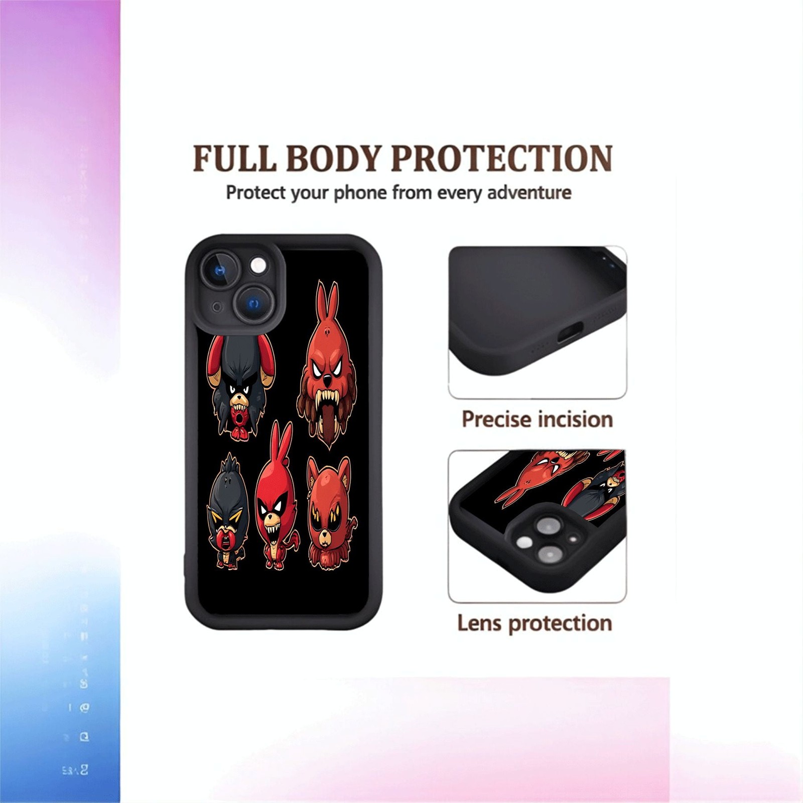 Design Highlights Single-sided printing for crisp, detailed back patterns – trendy and personalized. Material Premium TPU: flexible, durable, anti-slip, for reliable protection. Gender Gender-neutral, fits all users. Core Performance Superior Protection: Scratch-resistant & anti-yellowing coating (fights daily wear, slows yellowing). Precision Fit: Advanced molding for snug, lightweight fit (shields from scratches/minor drops, no bulk).Compatible Model For iPhone 15. Check your model for perfect fit. Care Wipe gently with a damp cloth; avoid corrosive cleaners (to protect patterns/material). Note Tiny gaps along print edges are normal for full-print designs (not defects, no after-sales coverage). Reminder Product images are for reference only. Slight differences in pattern size/positioning/color (due to production/lighting) are normal. ---Color This protective case is made of high-quality black TPU, giving it a stylish and eye-catching appearance, thereby enhancing the overall appeal. ---Design Engineered with built-in anti-scuff and anti-yellowing properties, it delivers reliable long-term performance and lasting durability. ---Perfect Fit & Protection Precision-engineered to fit seamlessly, it safeguards the screen against scratches and cracks—marrying visual charm with exceptional functionality. ---Quality Assurance Rigorously tested for thousands of hours during both design and manufacturing, this case blends striking aesthetics with meticulous craftsmanship. It effectively shields your iPhone from scratches and drop impacts, ensuring robust protection when you need it most. ---Ergonomic Design Crafted with ergonomics in mind, the case offers a comfortable, non-slip grip ideal for everyday use. Whether you’re making calls, texting, gaming, or taking selfies, it provides a secure hold for all your activities.