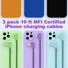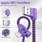【Fast Charge & Data Transfer】: The iphone charger cables are made of high purity copper core with overcharge protection, Safe and three-dimensional unconductive joint,automatic switching and battery protection .And ensure iPhone cable charges 30% faster than other iphone charging cable. Supports maximum 2.4A current and 480Mbps transfer speeds for your devices in 100% safe. 【Innovative 90 Degree Design】: 90 degree iphone charger provide carefree gaming experience, It is pretty convenient to charge when playing games and watching movies. The lightning charger will not press your hand,different from the ordinary iphone charger cable.You can avoid bending and breaking the data cable, and extends the service life. 【Extra Long 10 ft iPhone Charger】:Tangle-free Nylon Braided Lightning Cable has a long bend lifespan, stronger and flexible. Nylon material is stress and stretch resistant.10 foot iPhone charger cables are ideal to a variety of everyday connection needs and highly portable, easy to carry and use. 【Wide Compatibility】:MFi certified iPhone charger cable to ensure full charge and sync with iPhone 14/iPhone 13 mini/iPhone 13 Pro/iPhone 13 Pro Max iPhone 12/iPhone 11 Pro/iPhone 11 Pro Max/XS / Max / XR / X / 8 Plus / 8 / 7 Plus / 7 / 6s Plus / 6s / 6 Plus / 6 / 5s / 5c / 5 / iPad Pro / iPad Air / Air 2 / iPad mini / mini 2 / mini 4 / iPad 4th gen / iPod Touch 5th gen / .Fit most phone case(note:not suitable for too thick case.) 【What You’ll Get】: ( 1*Purple 1*Green 1*Blue) 3 pack 10 ft MFI Certified iPhone charging cables .Your family member can own their special lightning cables of an individual color.This iPhone charger cord is long enough to charge your device in bedroom, sofa, office, and travel!Friendly and reliable customer service will respond to you within 24 hours !